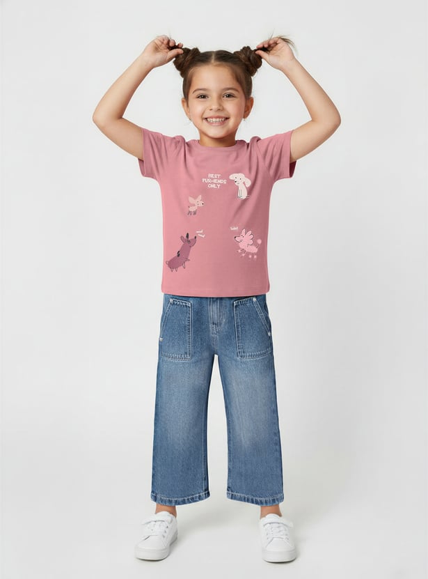 Charming girls’ round neck t-shirt with half sleeves and vibrant prints, crafted for a soft, breathable, and comfortable fit. Ideal for school, outings, or casual play.