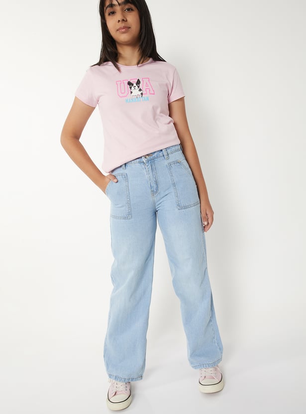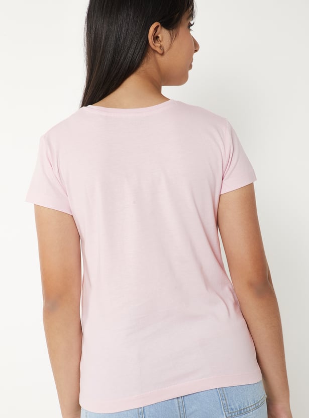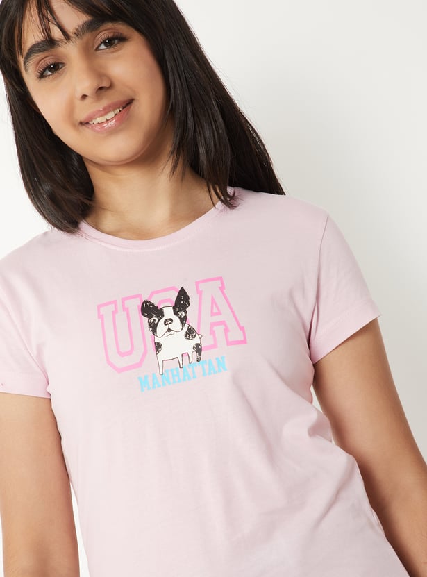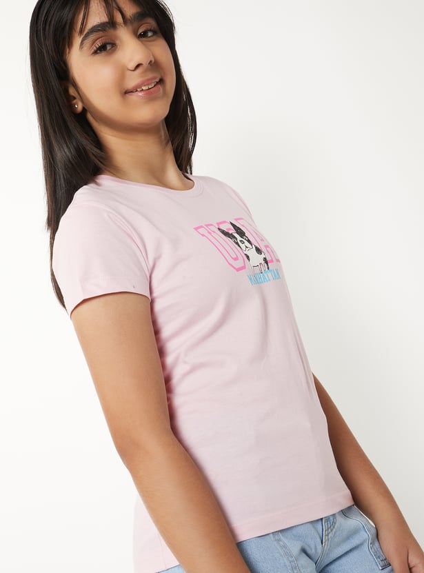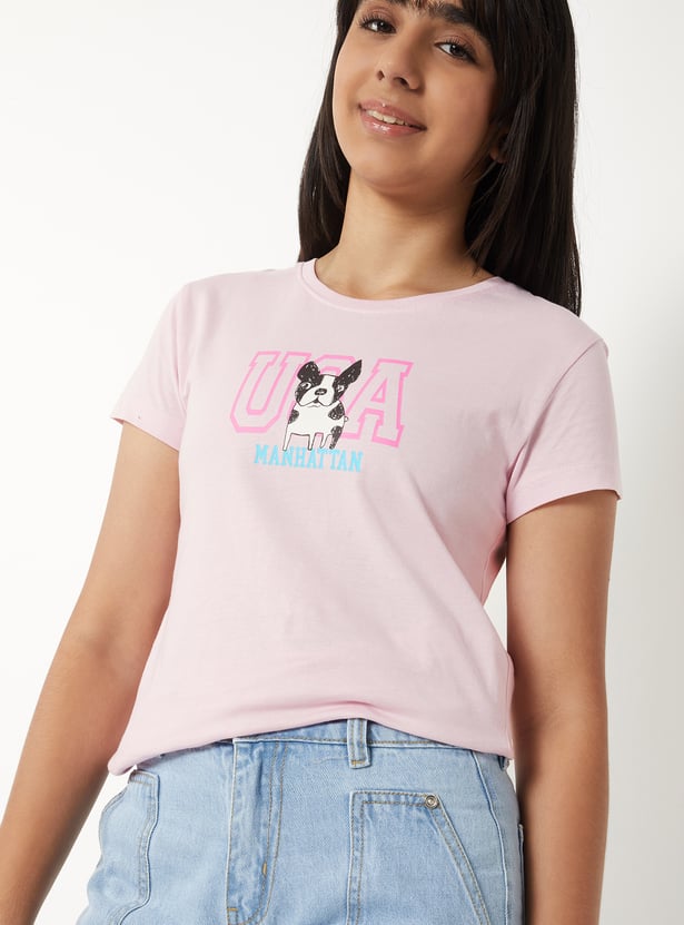 Add a playful edge to your casual wardrobe with this T-shirt. Featuring a vibrant print, a classic round neck, and comfy half sleeves, it's the perfect blend of fun and style.