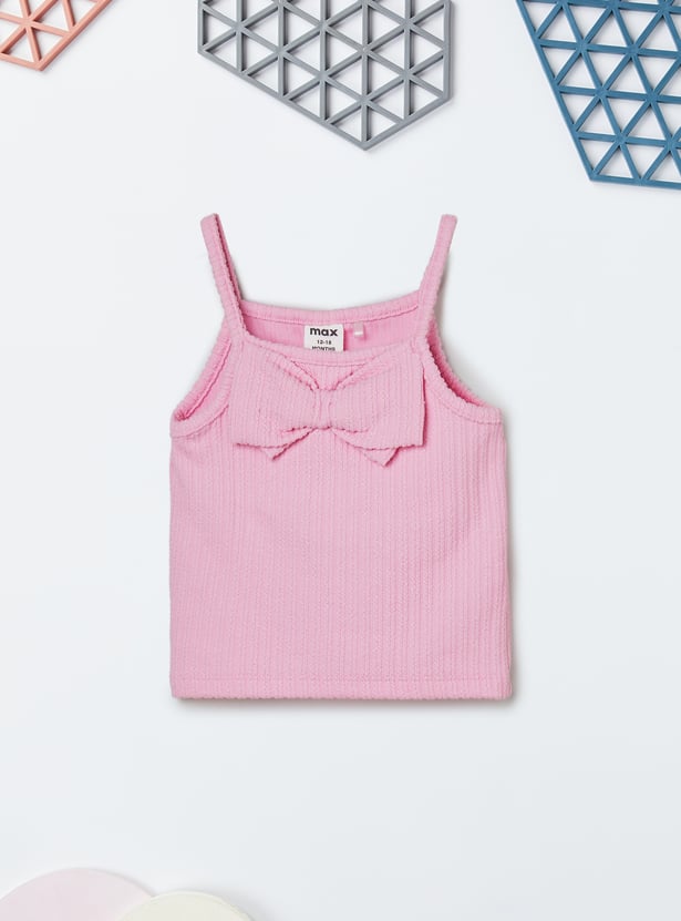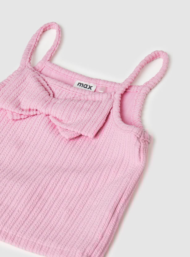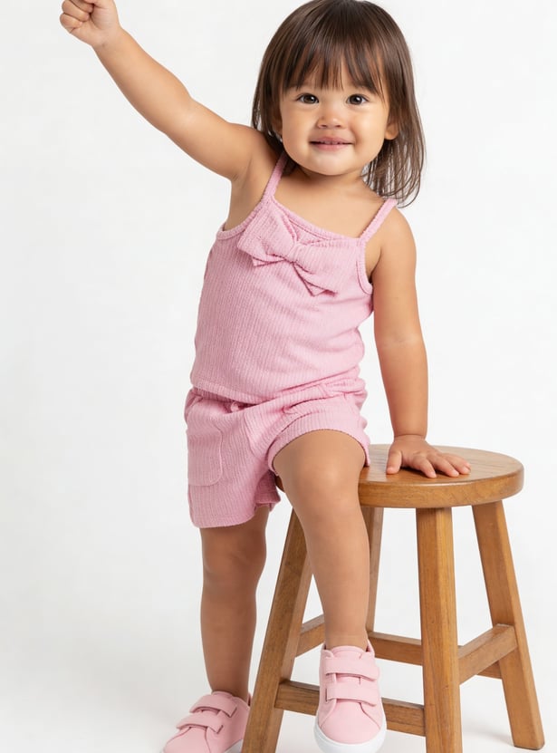 This ribbed shorts set includes a sleeveless top with spaghetti straps, a square neckline, and a bow detail on the chest. The matching shorts feature side pockets, an elasticated waist, and a drawstring for everyday comfort.