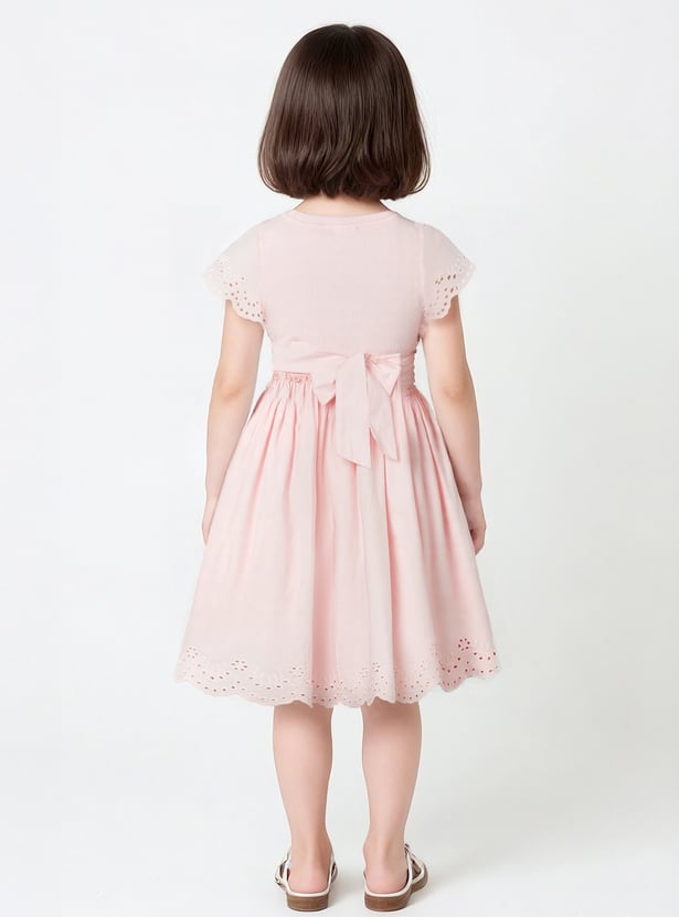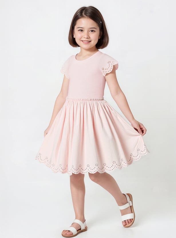 This Schiffli dress features a ribbed top with round neck and a flared skirt for a flattering silhouette. Designed with half sleeves and delicate Schiffli trims along the edges, it blends casual charm with feminine detail. Perfect for daytime outings or relaxed gatherings.