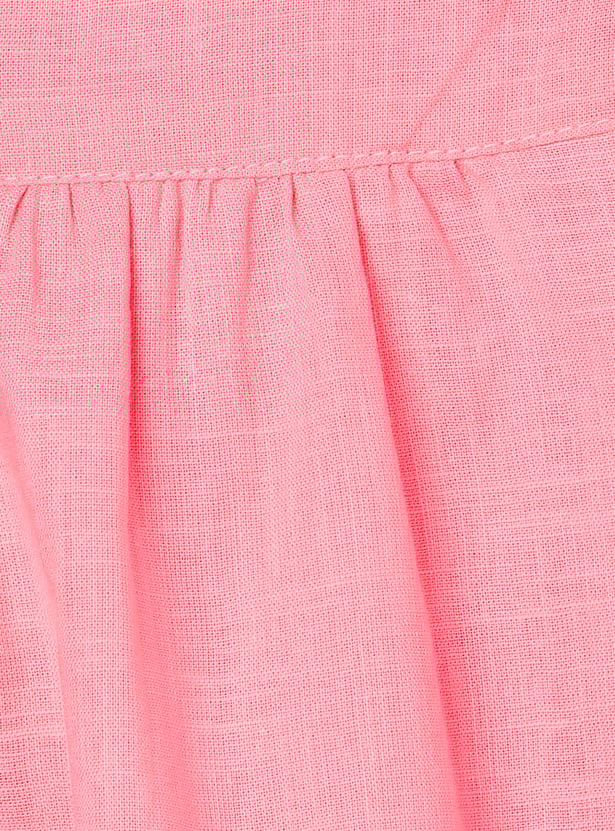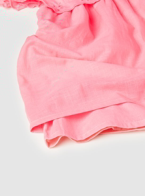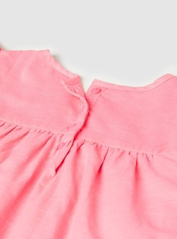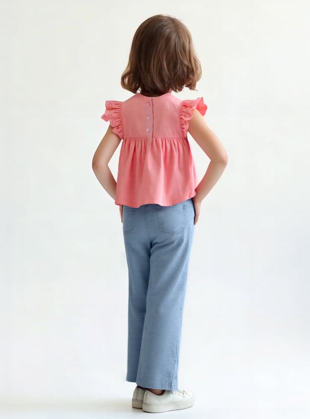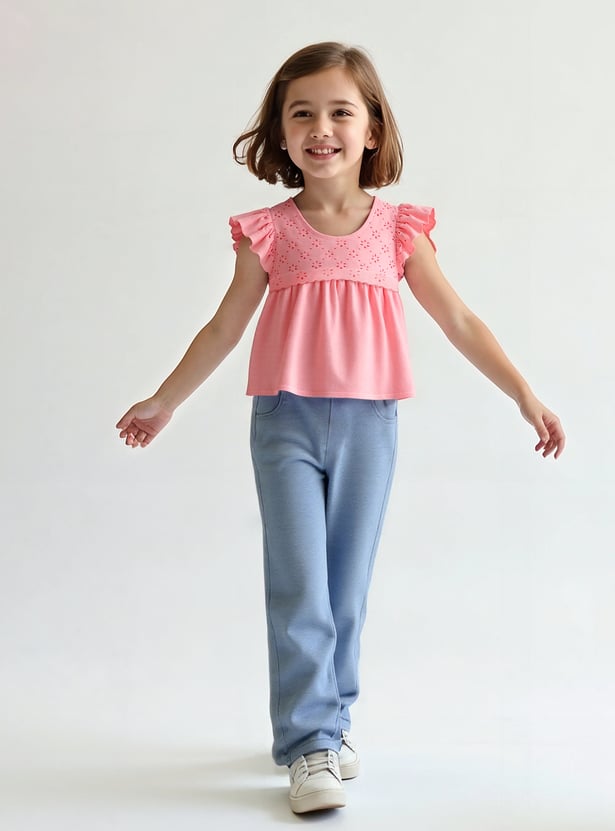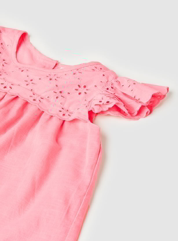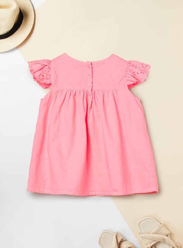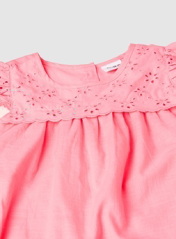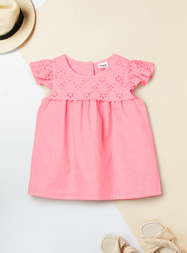 This Schiffli embroidered top brings timeless charm to your wardrobe. Featuring intricate embroidery, a round neck, button closure, and half sleeves, it offers a graceful look.