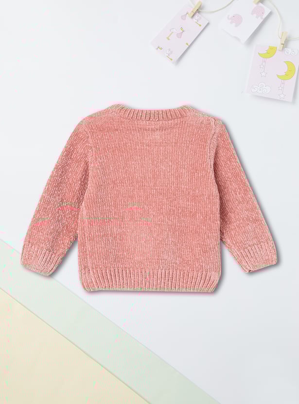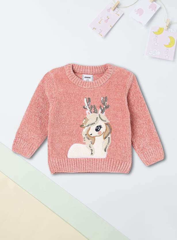 Bring the holiday spirit to life in the cutest way with this chenille sweater. Featuring a beautifully embroidered reindeer applique with sparkling sequinned accents, it is perfect for any cosy winter day. The round neck, full sleeves, and ribbed trim provide a comfortable and flattering look.