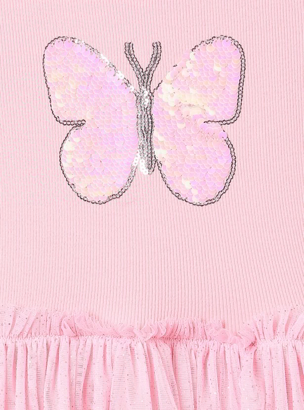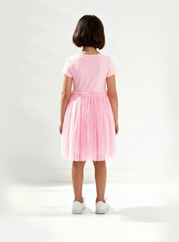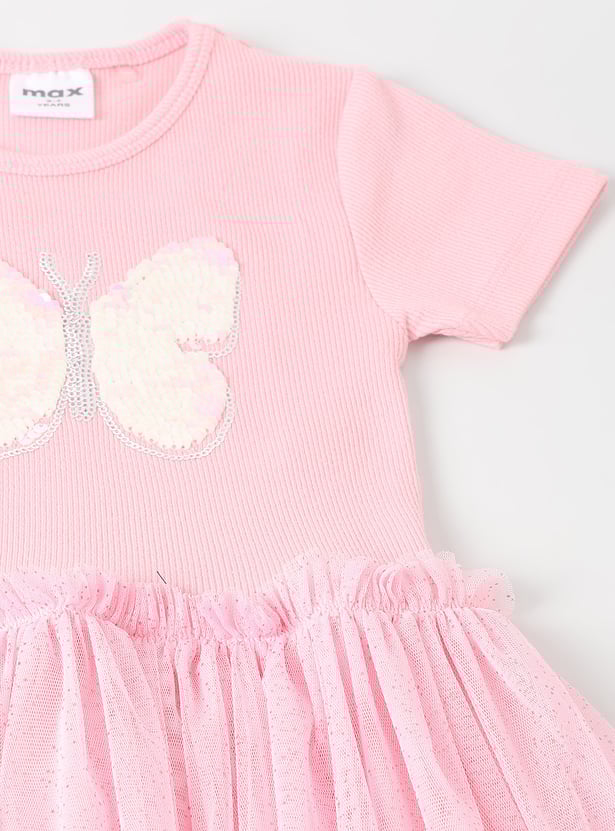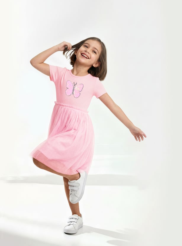 This sequinned rib tulle dress is perfect for special occasions, featuring a shimmery sequin-detailed ribbed bodice and a soft tulle skirt. Designed with a round neck and half sleeves, this knee-length dress blends sparkle with elegance for a picture-perfect look.