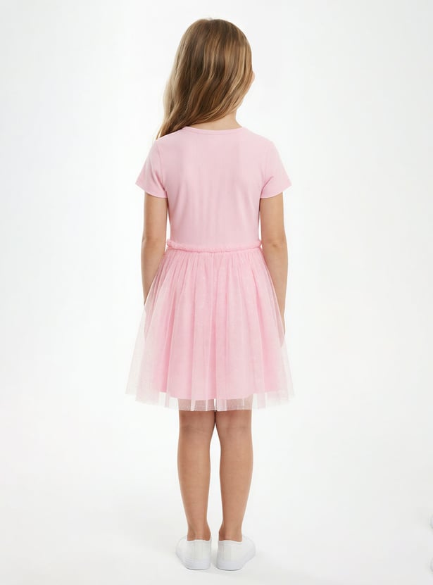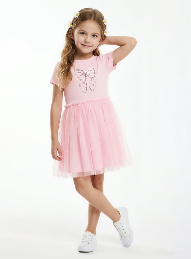 This tulle dress features a soft, layered skirt with sequinned detailing on the chest for a touch of sparkle. It is designed with a round neckline and half sleeves for a balanced, comfortable silhouette.