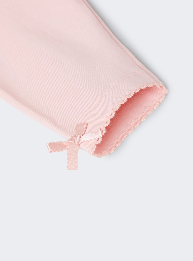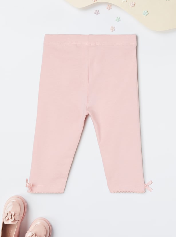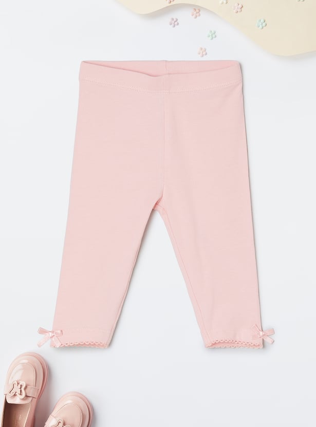 Amp up your little diva's casual look with this stylish pair of solid leggings. Designed with an elasticated waistband for a comfortable fit, they feature a charming lace trim and a cute bow at the hem, adding a delightful touch to her everyday outfits.