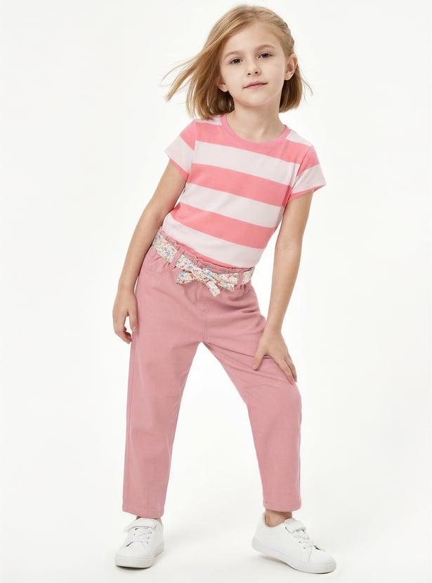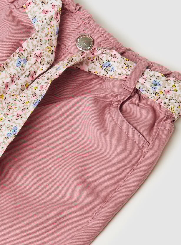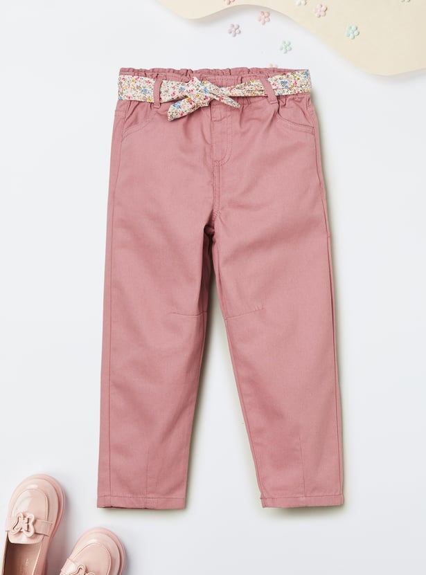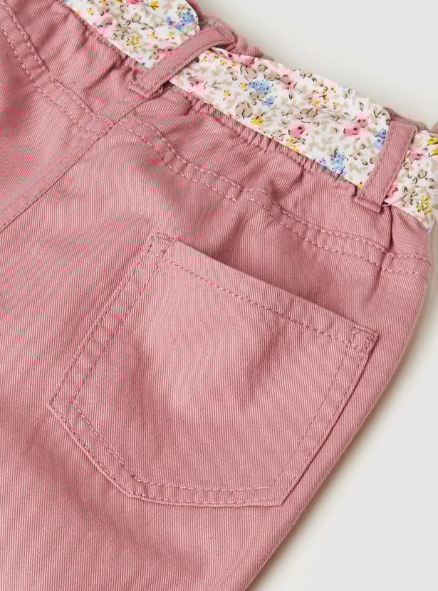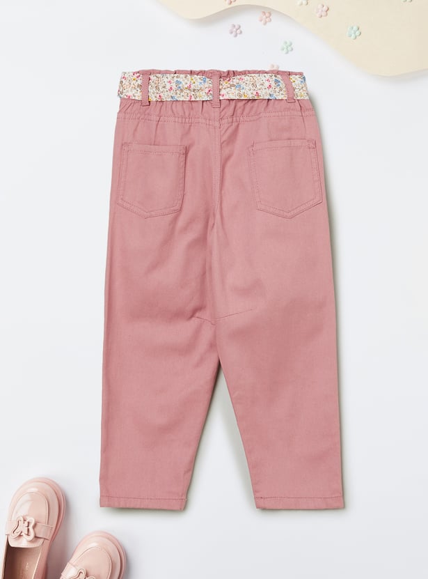 These full-length, solid, straight trousers feature two side pockets and two back pockets for a clean, functional design. Finished with an elasticated waist, button and zip closure, and a floral-patterned belt, they offer comfort with a playful accent.