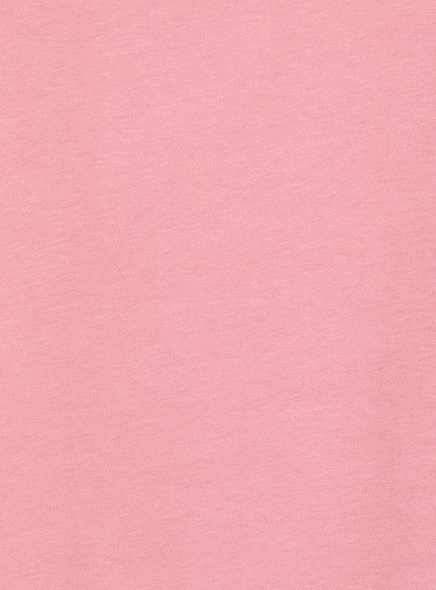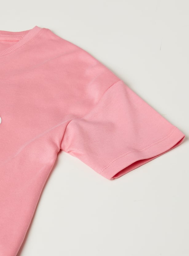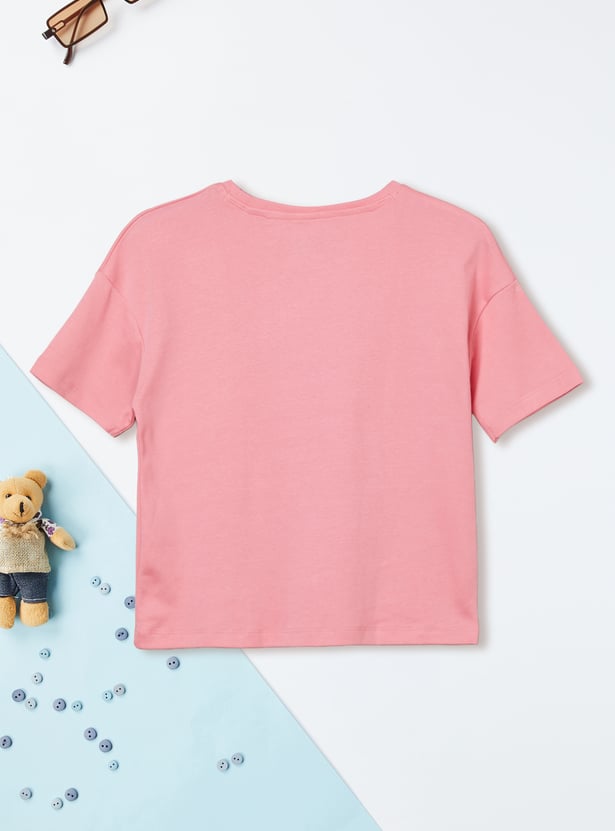 This oversized, cropped SpongeBob T-shirt features a round neck, half sleeves, and sparkling sequinned accents, combining playful charm with a trendy silhouette.