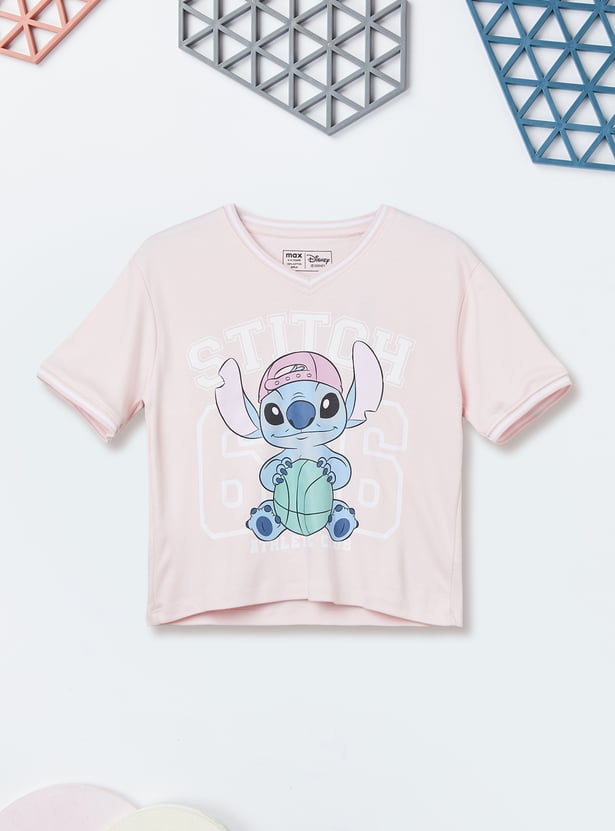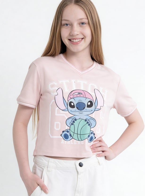 Add playful charm to her wardrobe with this stitch print T‑shirt. Designed with a V‑neck and half sleeves, it offers everyday comfort with a stylish twist.