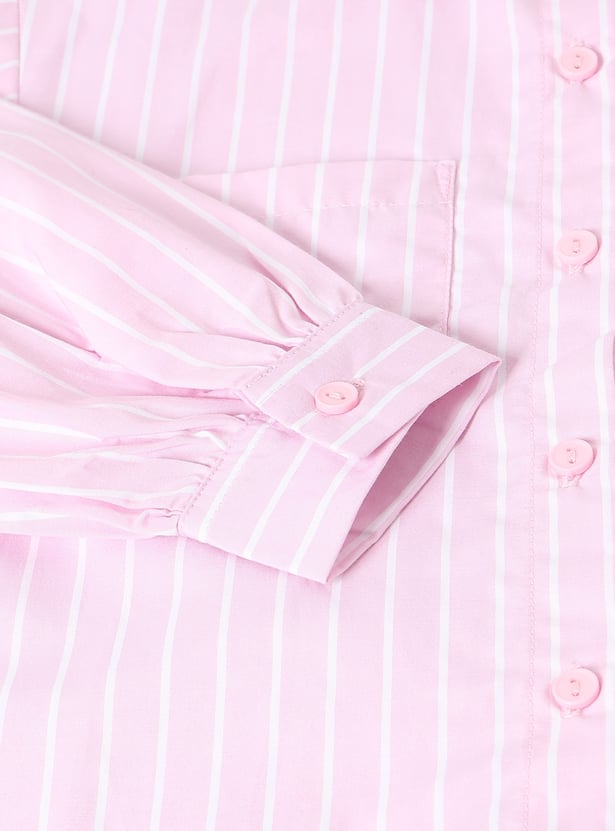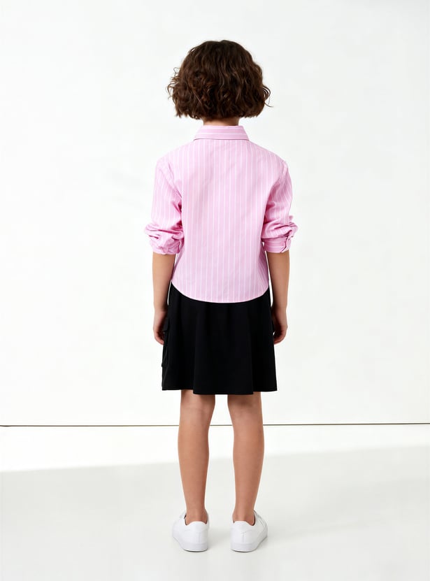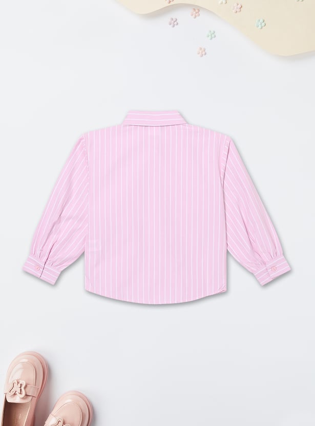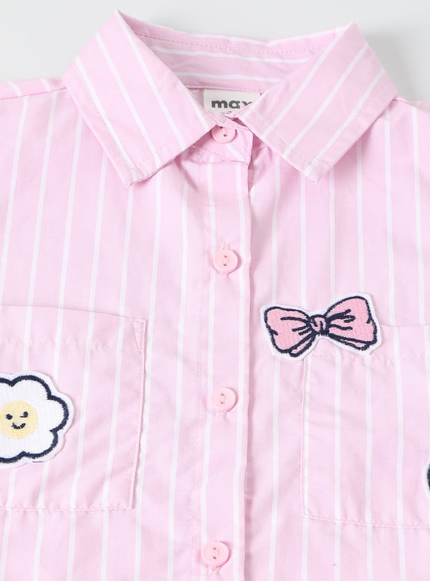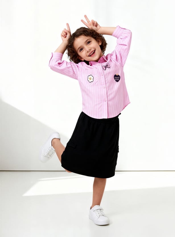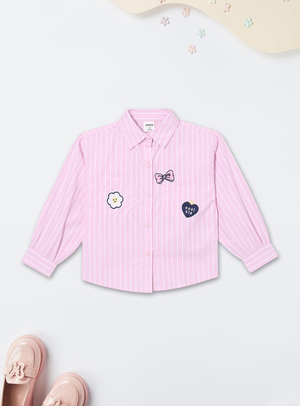 Add a playful twist to your look with this striped regular fit shirt, featuring a spread collar, button placket, full sleeves, and a cute applique detail for extra charm.