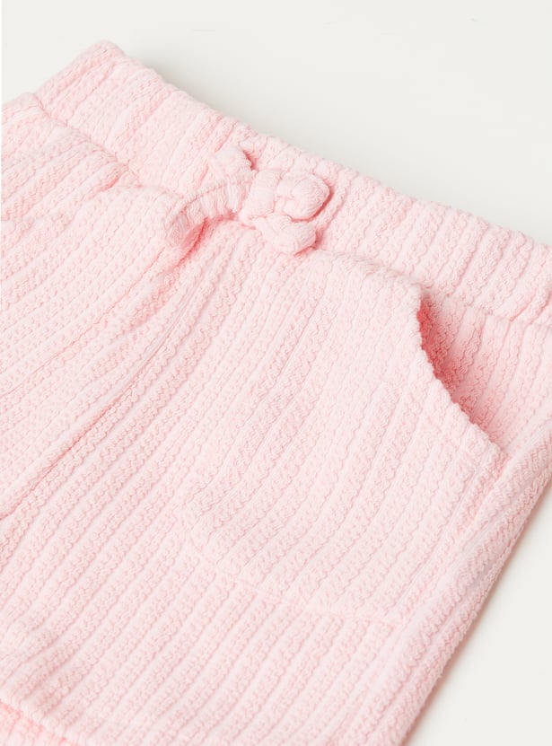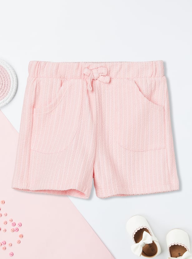 Keep it cute and comfy with this textured shorts set, featuring a square-neck, sleeveless top with delicate spaghetti straps, and a sweet bow appliqué. Paired with matching shorts that have handy pockets and a drawstring closure for the perfect fit.