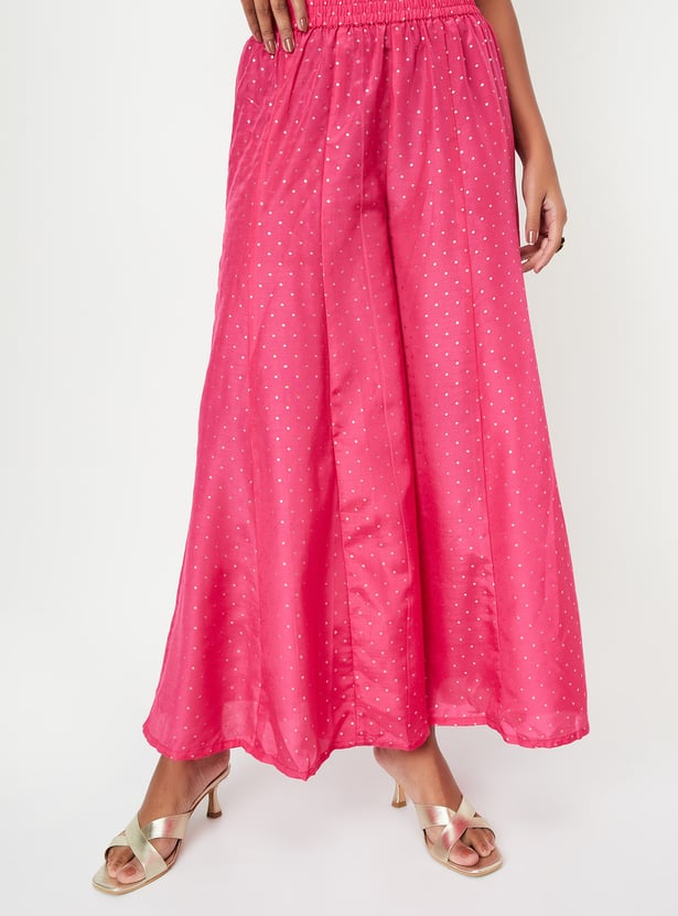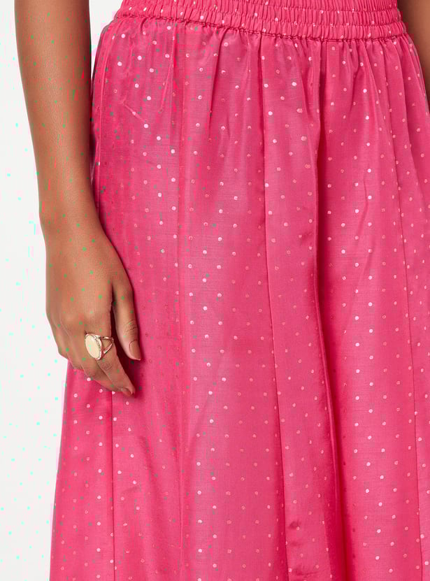Flaunt an elegant look with this exquisite ethnic set. The embellished straight kurta, featuring a scoop neck and sleeveless silhouette, is paired with printed flared pants and a matching dupatta. This set exudes grace and sophistication, perfect for making a stylish statement on any occasion.
