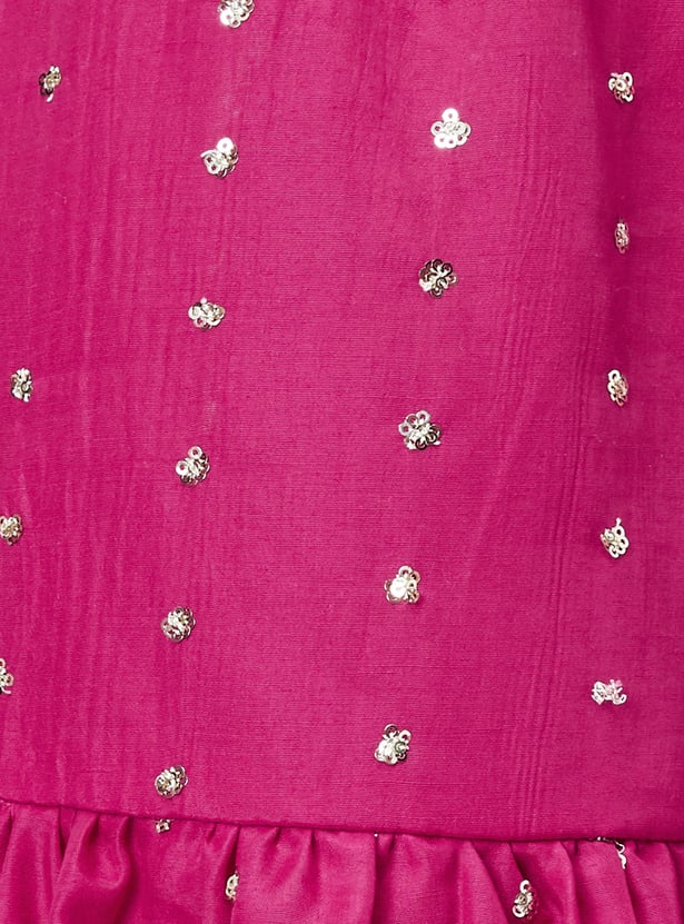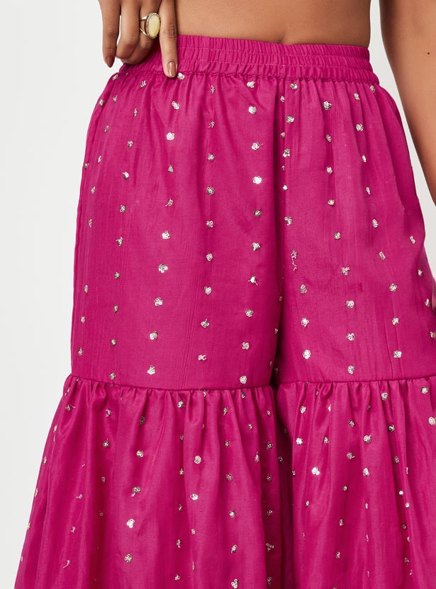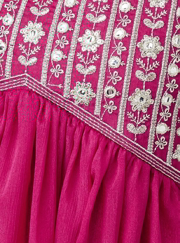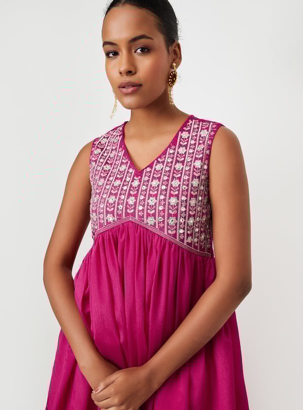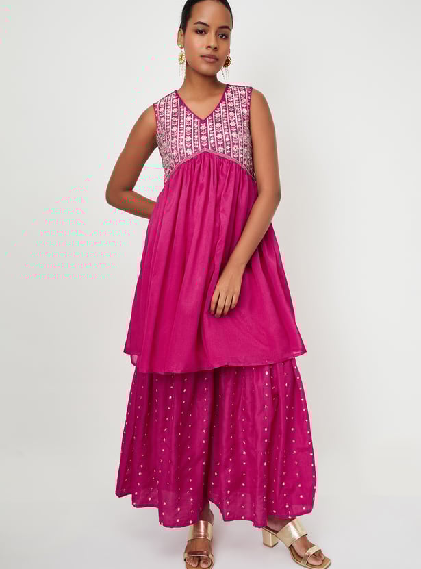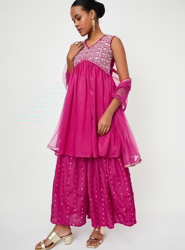 A wardrobe essential, this ethnic set is updated with embroidery. It includes a flared kurta with a V-neck and sleeveless design. Complemented by a pair of embellished sharara pants with an elasticated waist and a dupatta, this set effortlessly blends traditional charm with contemporary style.