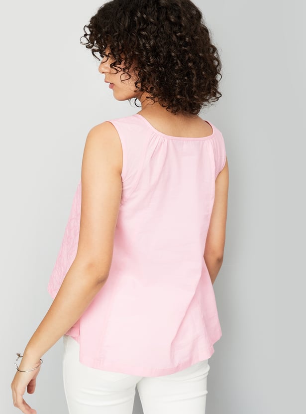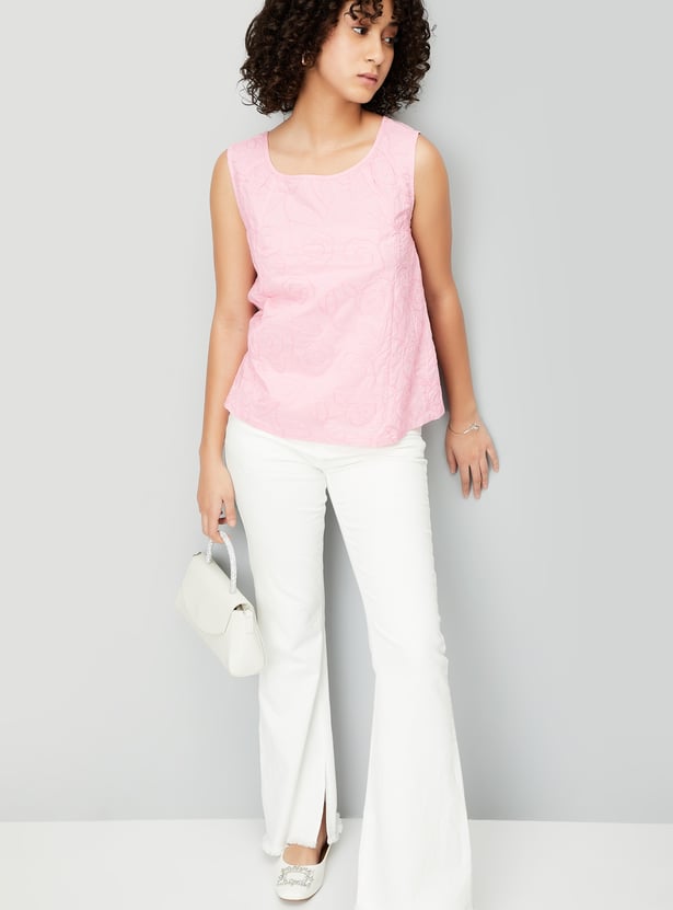 Add a touch of charm to your wardrobe with this embroidered top, featuring a flattering square neck and a sleeveless design. Perfect for warm days, it combines delicate detailing with effortless style.