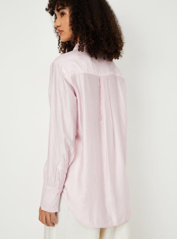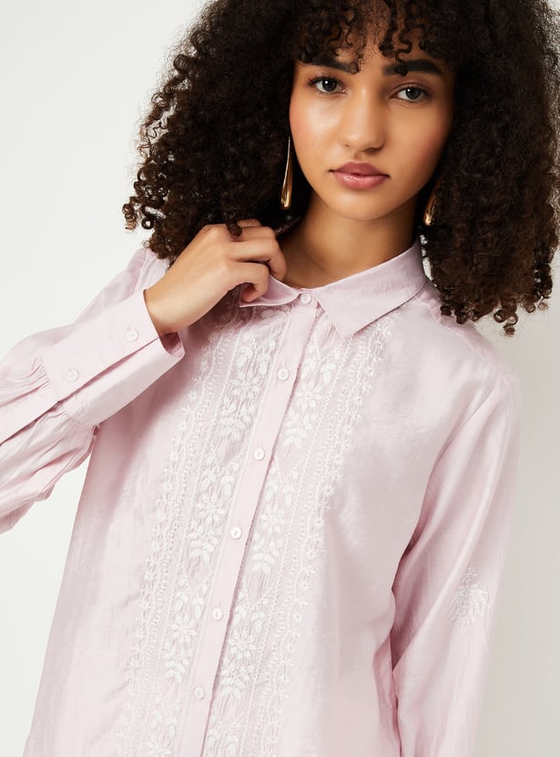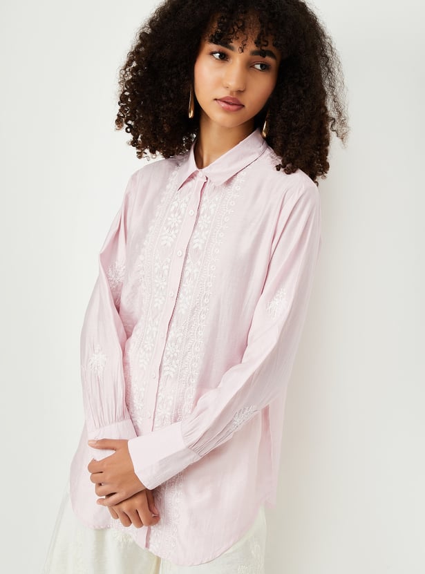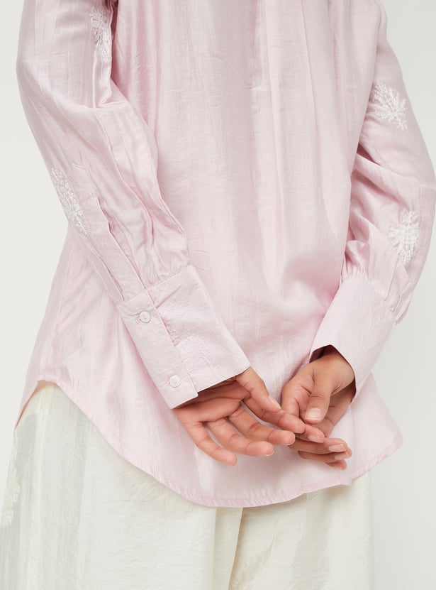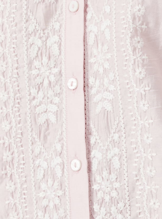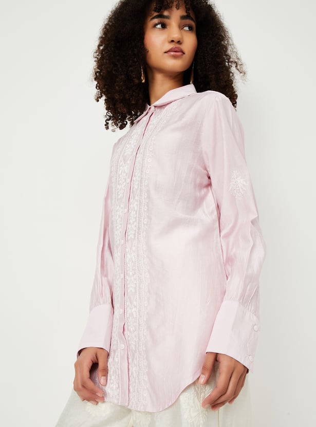 This embroidered tunic exudes elegance with its intricate detailing, spread collar, and button placket. The full sleeves with button cuffs complete the classic, refined look, making it perfect for both casual and dressy occasions.