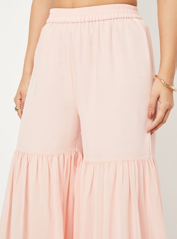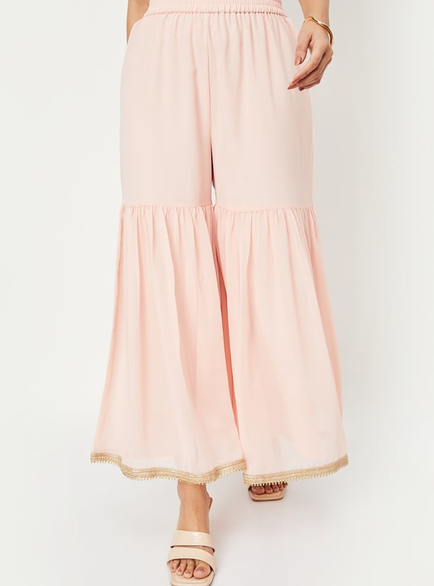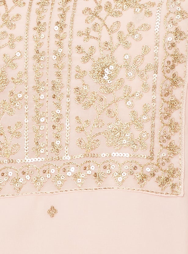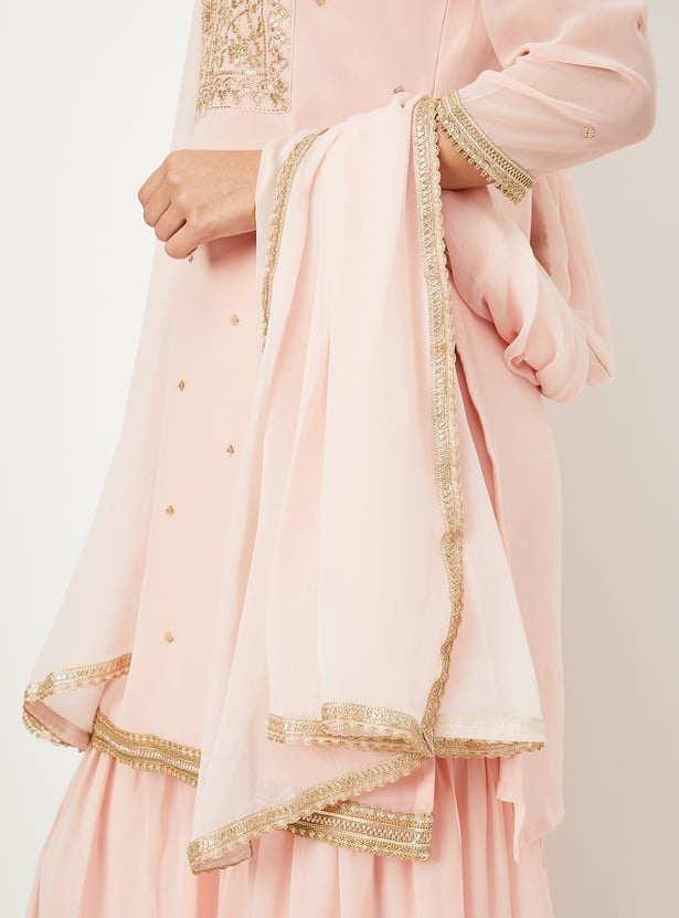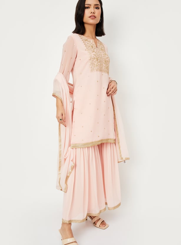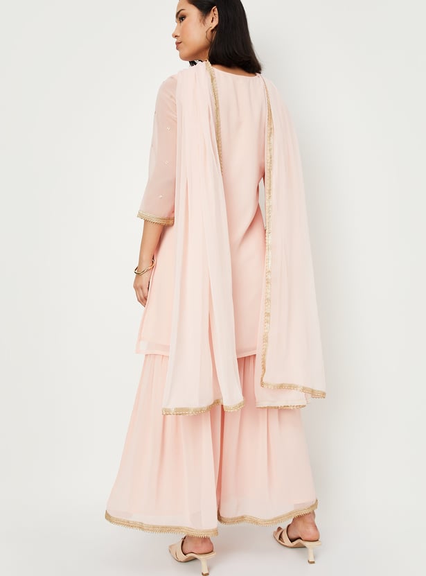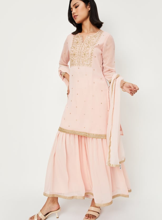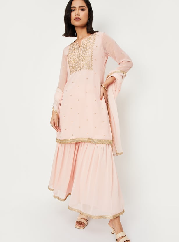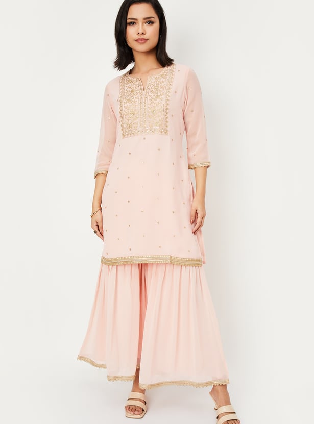 Dress up for occasions in this ethnic set. It includes a straight kurta with a notched neck, sequined embroidery at the yoke, and three-quarter sleeves. The pair of sharara pants has an elasticated waist and gota patti border. The dupatta with the border completes the look.