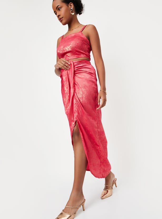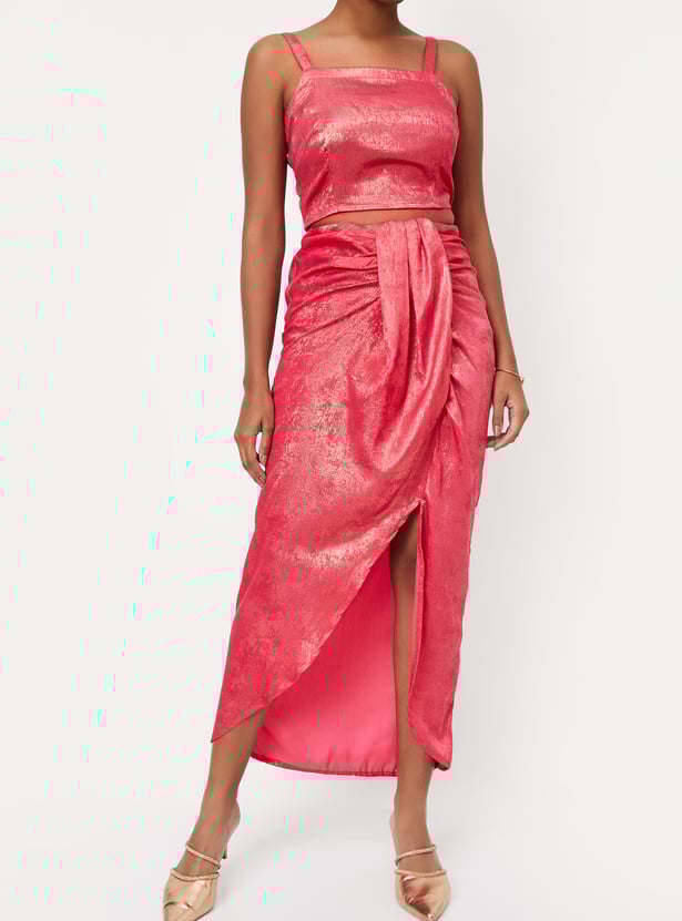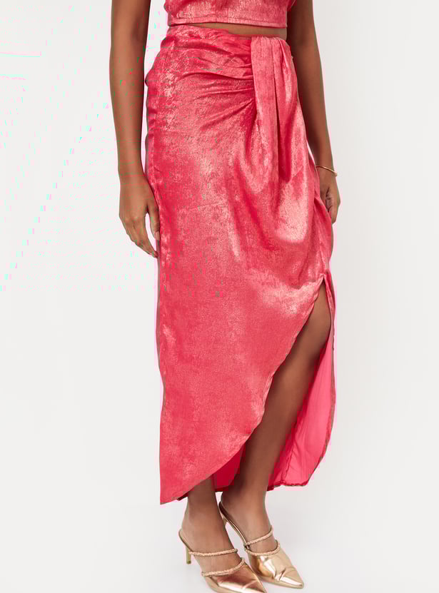 Elevate your ethnic look with this stunning shimmer skirt! Featuring a draped design, front slit, elasticated waist, and a chic maxi-length silhouette, it adds a touch of glamour and sophistication to any ensemble. Perfect for making a statement at your next festive event.