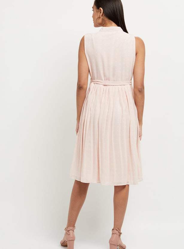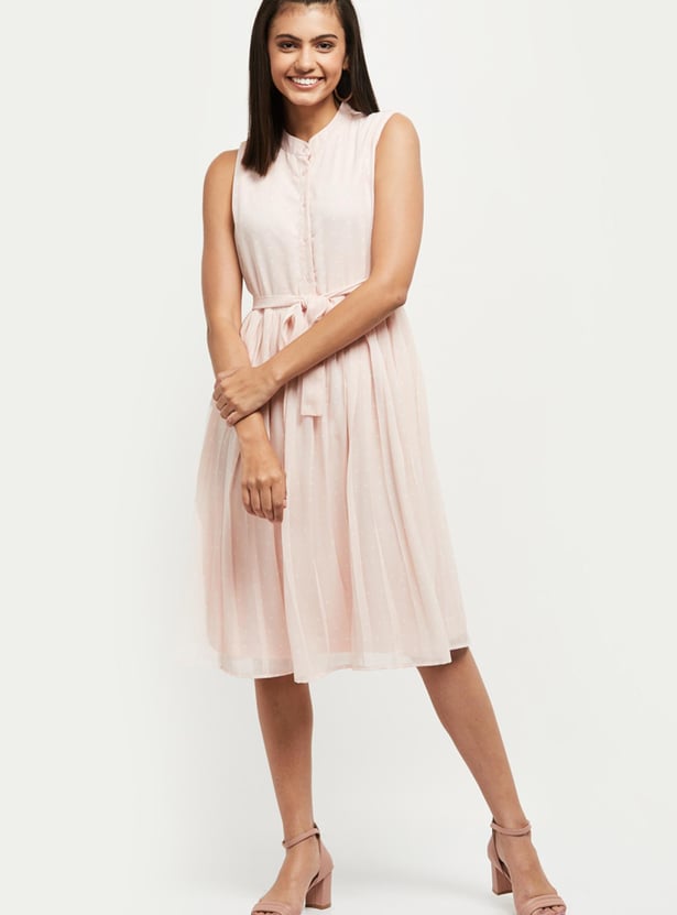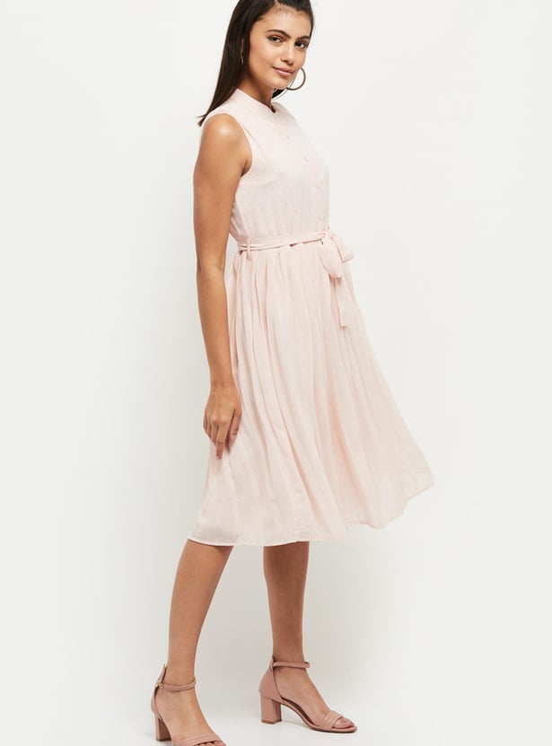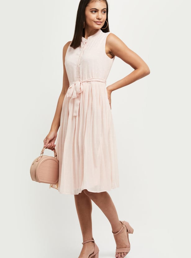 Elegant and comfortable, this printed A-line dress which has a band collar, sleeveless construction, and tie-up waist is all you need to ensure your wardrobe is up to date.