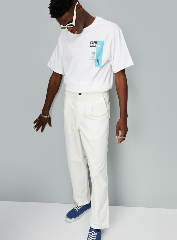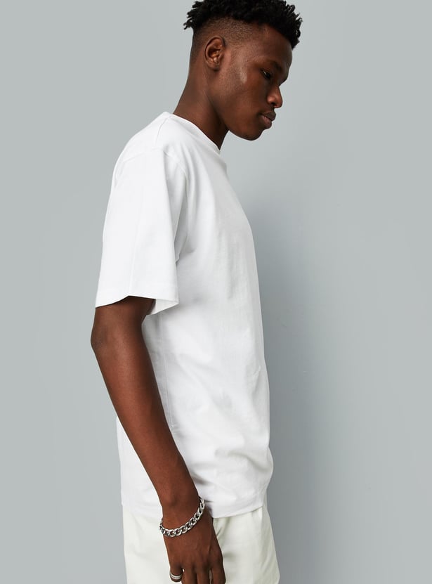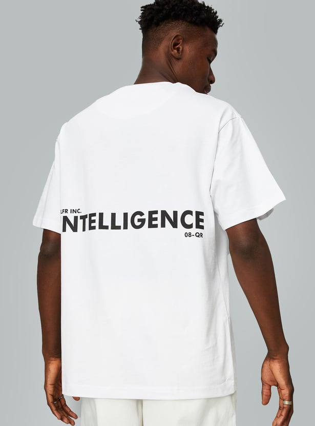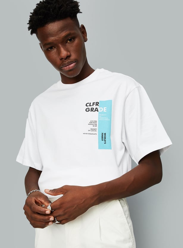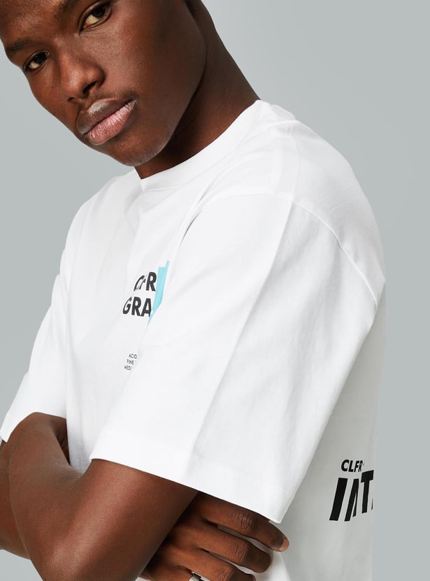 It's time to up your style quotient with this graphic T-shirt that has a crew neck, drop shoulders, half sleeves, and a typographic print on the back. Team up this relaxed-fit tee with a pair of shorts and lace-up shoes to complete the look.