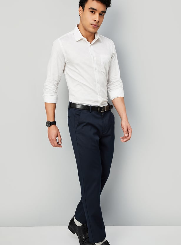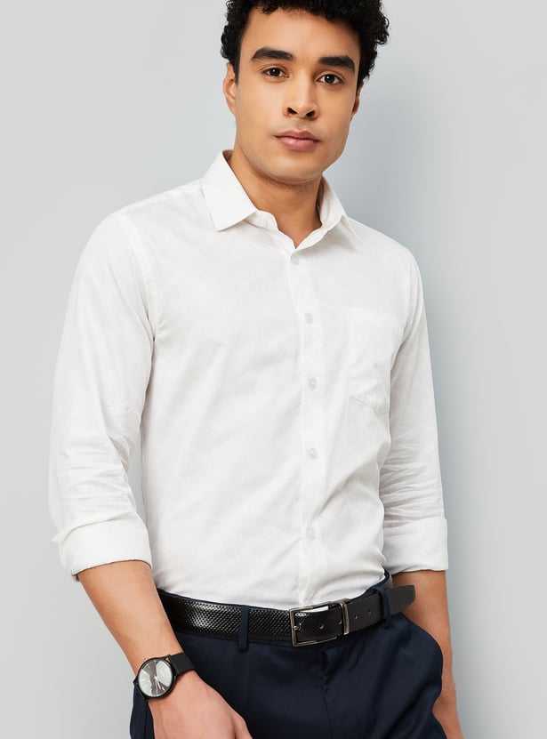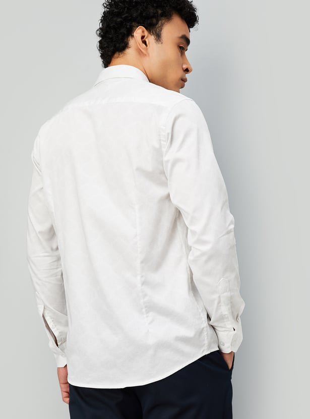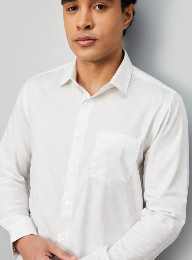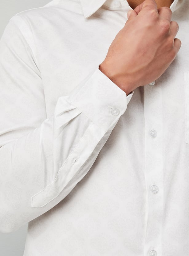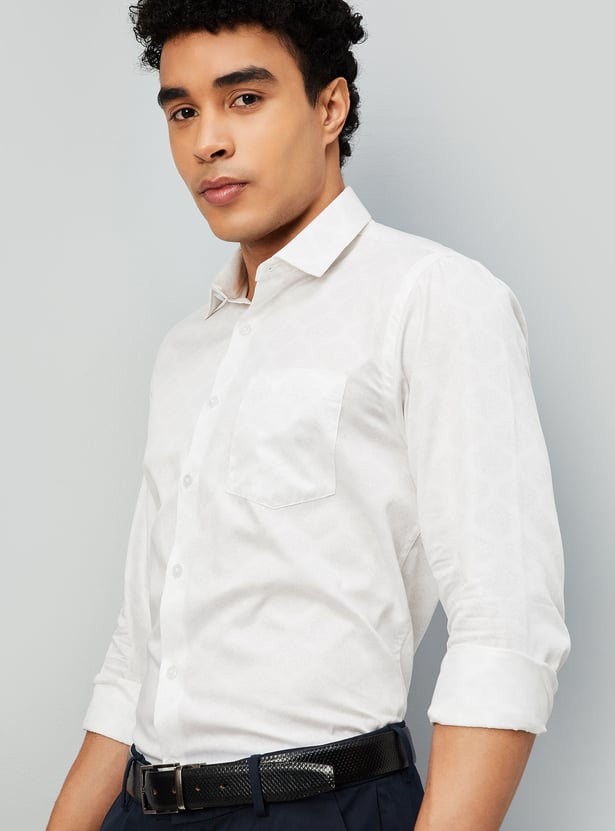 Upgrade your formal wardrobe with this slim-fit printed shirt, featuring a sharp spread collar and full sleeves with buttoned cuffs for a refined touch. Designed with a button placket, a functional patch pocket, and a curved hem, it blends classic sophistication with modern style.