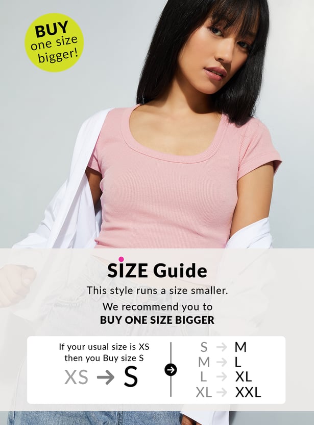 Add a trendy basic to your wardrobe with this ribbed crop t-shirt, featuring a scoop neck and half sleeves. The ribbed texture and cropped length make it a stylish pick for casual, everyday looks.