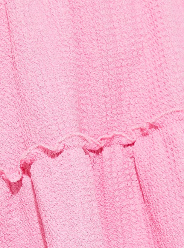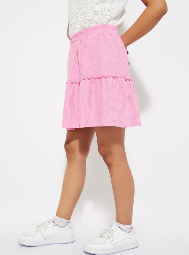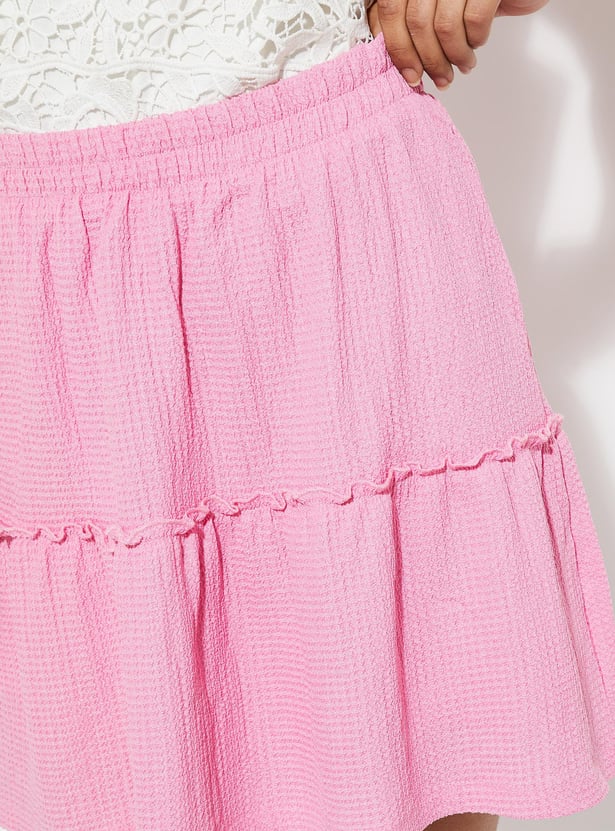 Make a bold urban statement in this textured mini skirt, complete with an elasticated waist and an A-line profile. Perfect for navigating city streets with style and confidence.