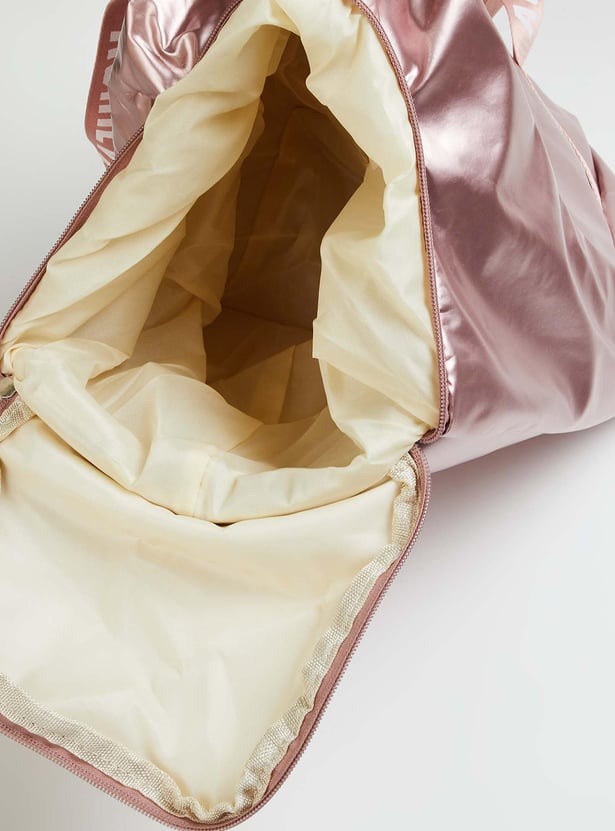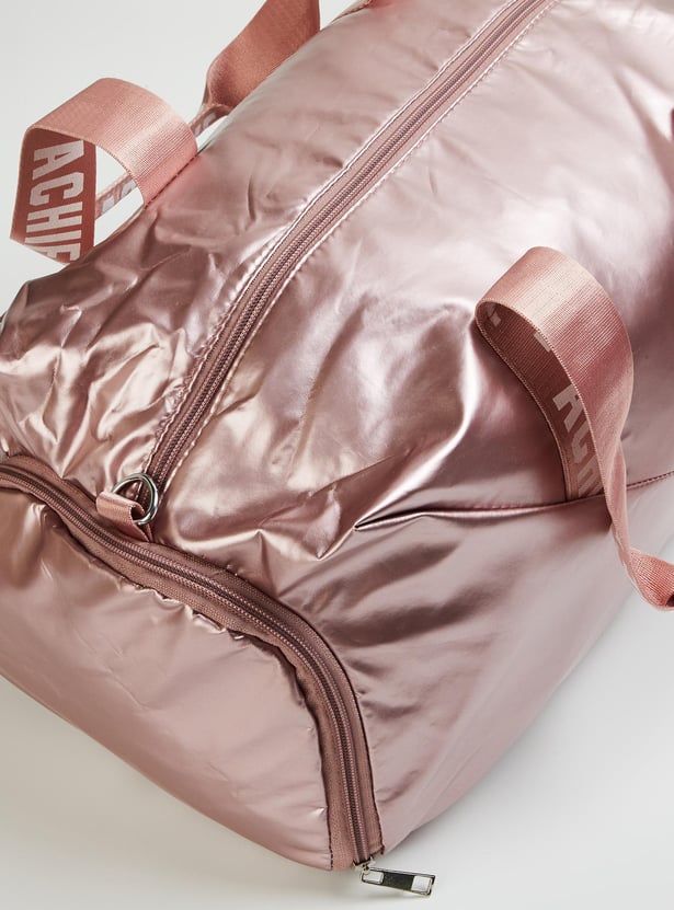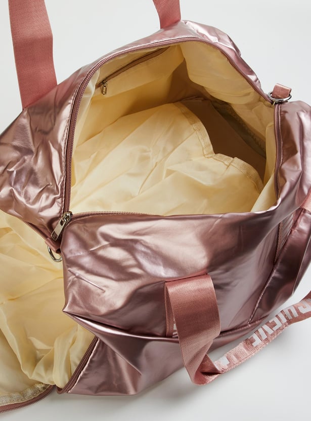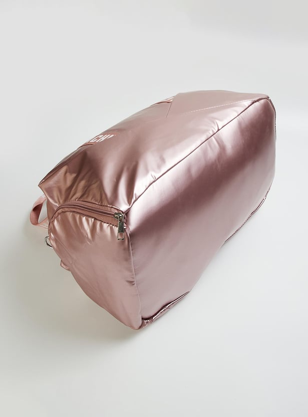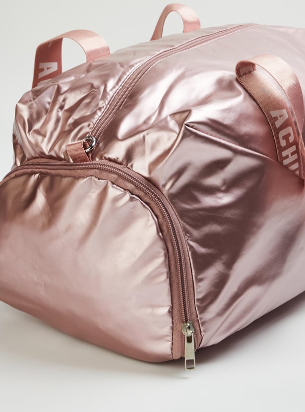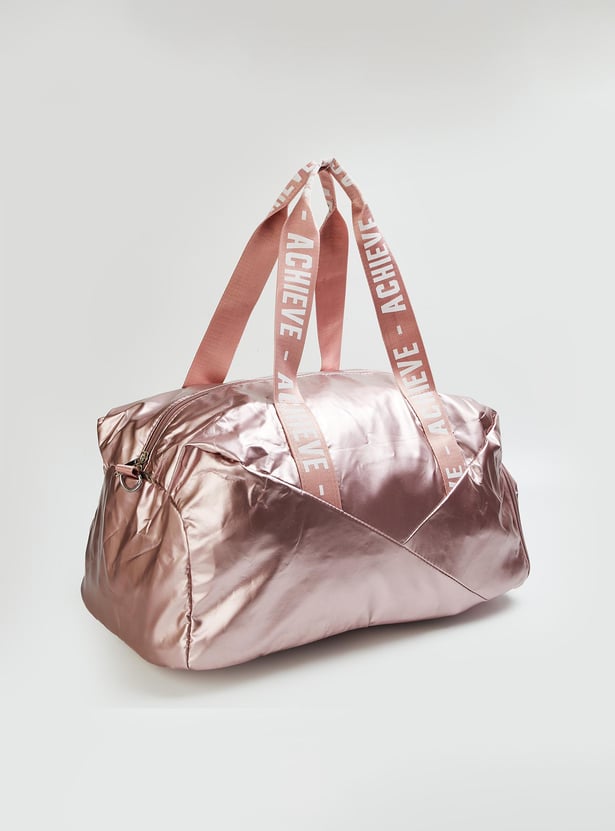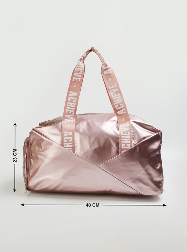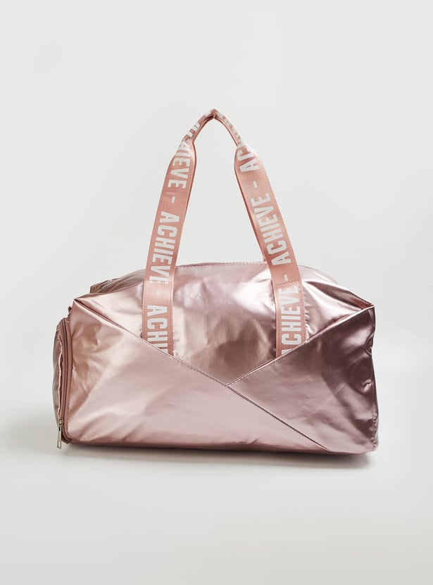 Stay on top of your fitness along with style goals with this gym bag. It features printed straps, a detachable strap, and a side zip entry for shoes. The main compartment has a zip top and an interior zip pocket.