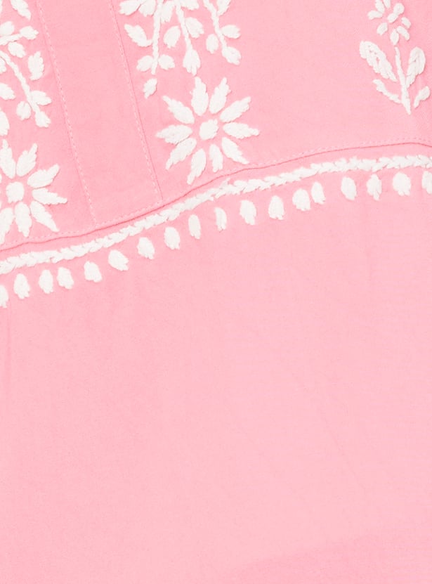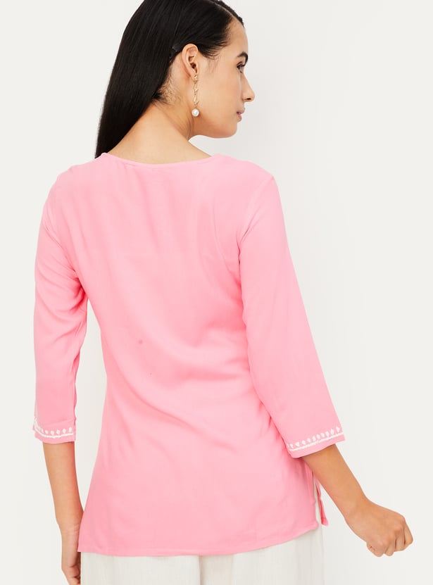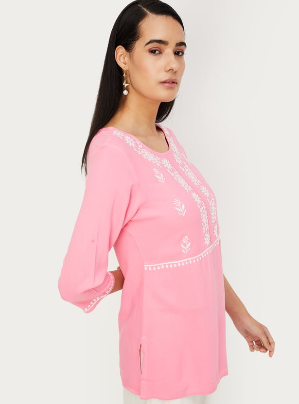 Flaunt a look of elegance in this kurti, It is with an embroidered design, a round neck, three-quarter sleeves, and a short length.