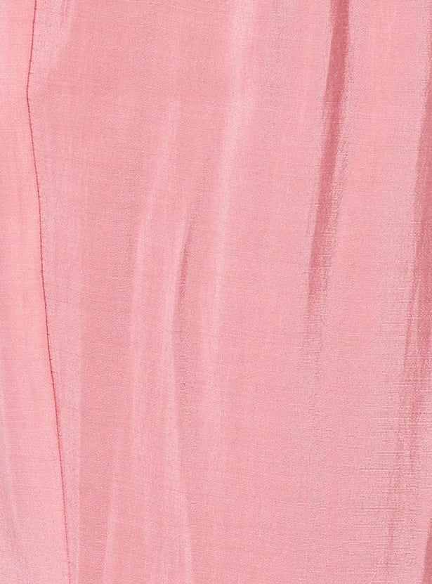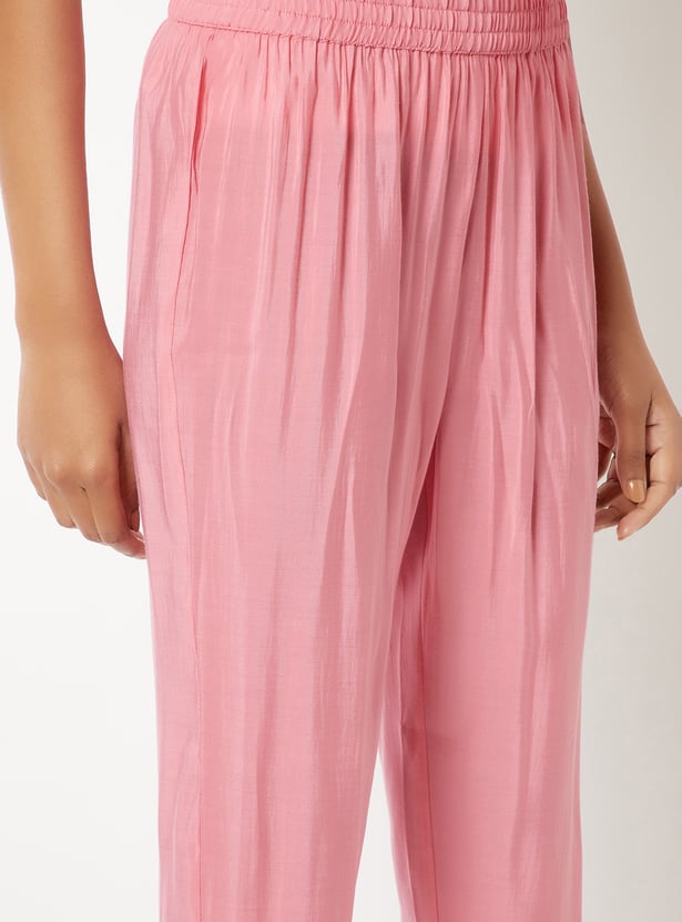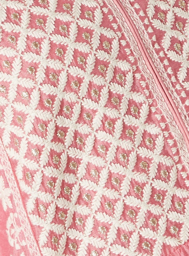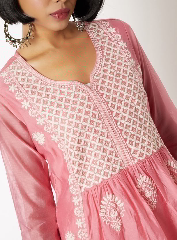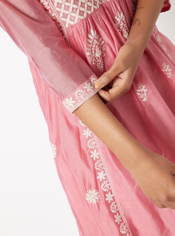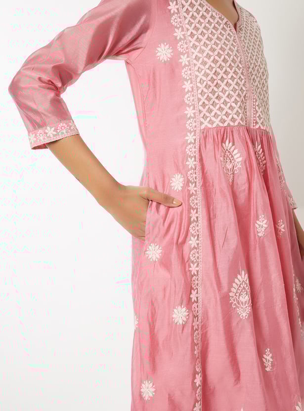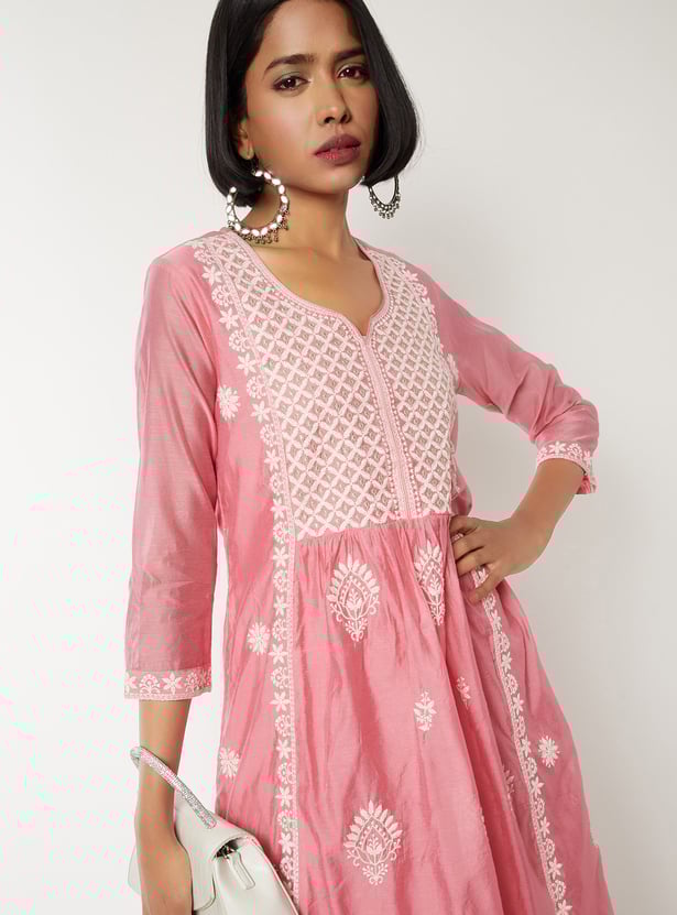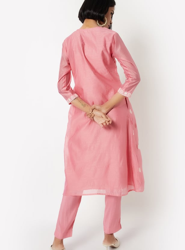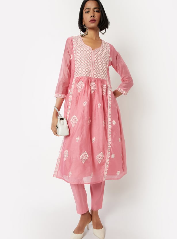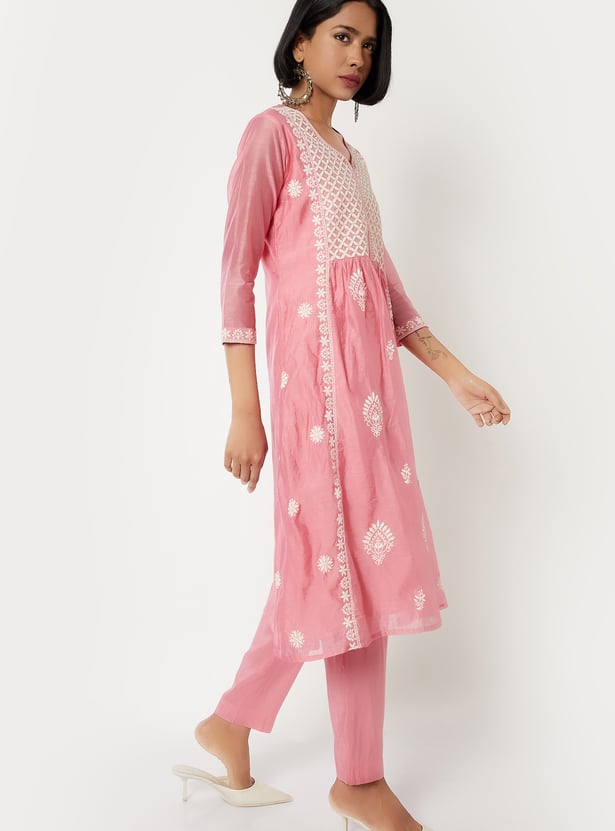 Make a graceful statement with this embroidered A-line kurta set. The kurta features a notch neck and 3/4th sleeves, paired with straight pants designed with an elasticated waist for all-day ease.