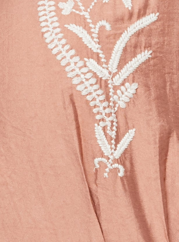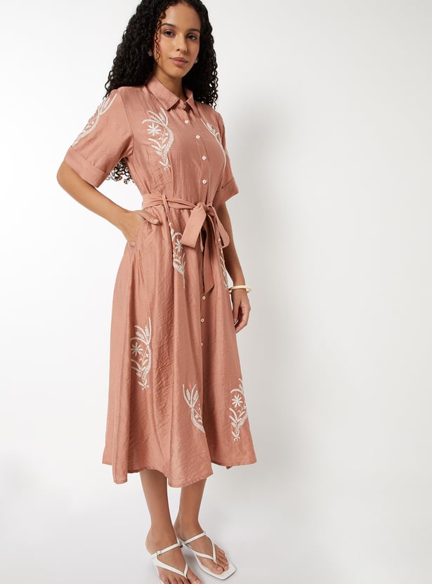 Step out in timeless style with this embroidered A-line shirt dress featuring a spread collar, button placket, belted waist, half sleeves, and handy side pockets. The belt cinches the waist to enhance your silhouette, combining elegance with comfort.