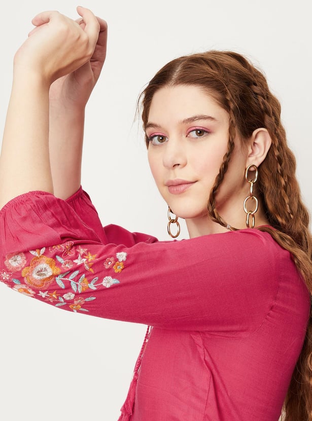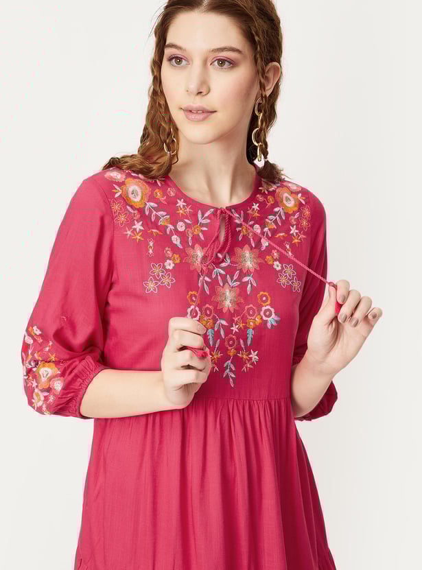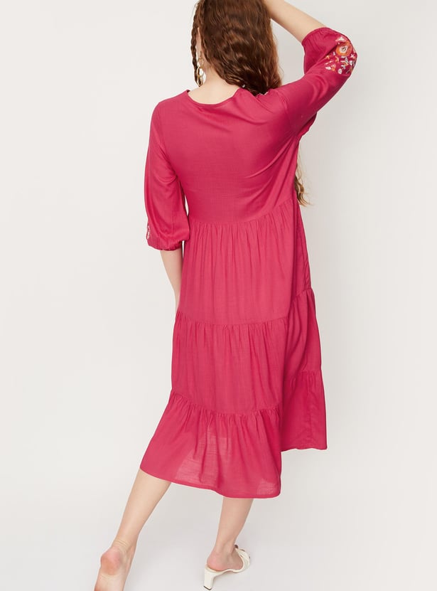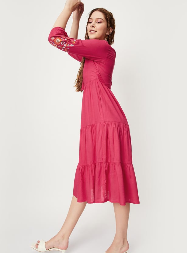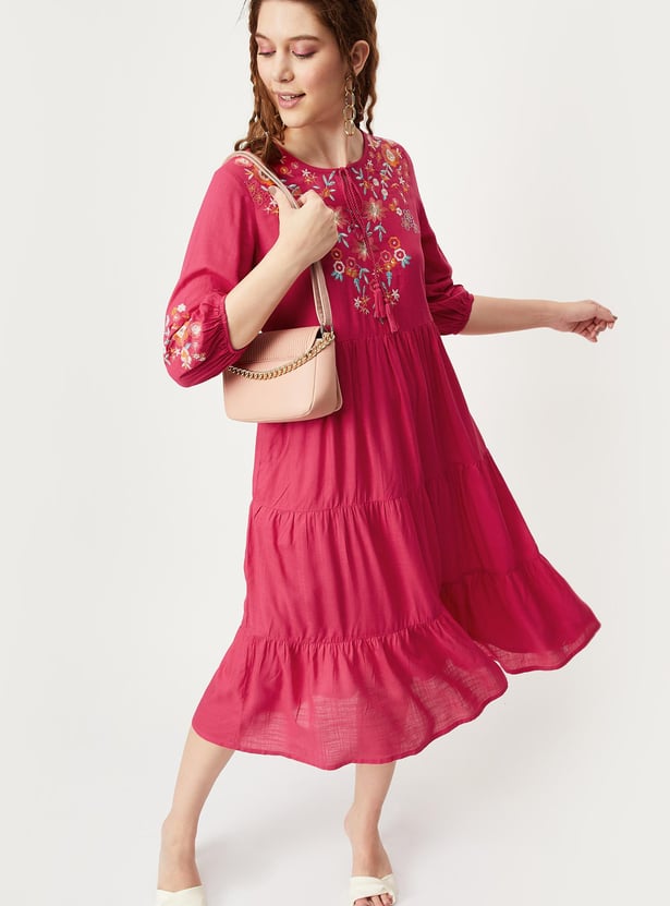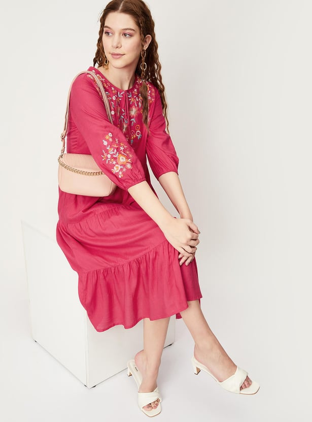 For those long summer days, opt for the elegant midi dress highlighted with floral embroidery on the yoke and sleeves. It features a tie-up neck, blouson sleeves, and a tiered profile. Team up this dress with block heels to perfect your weekend look.