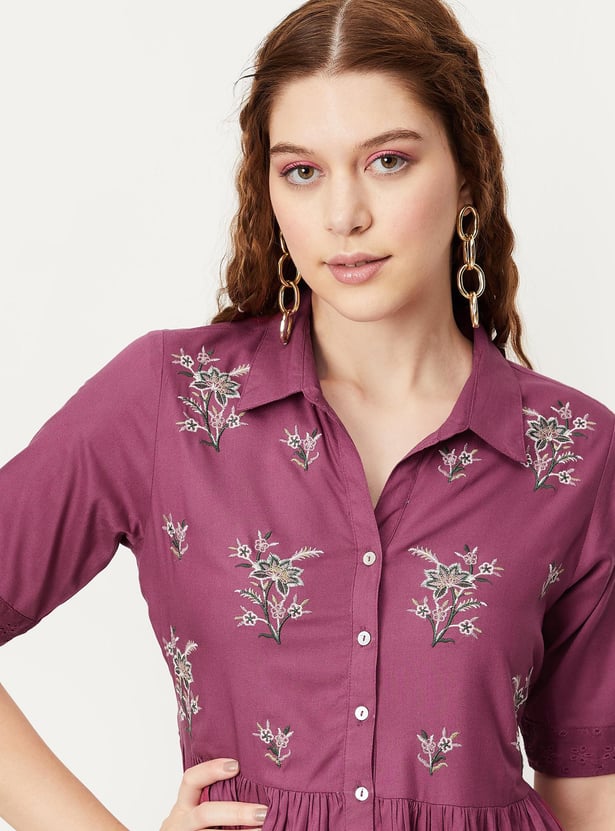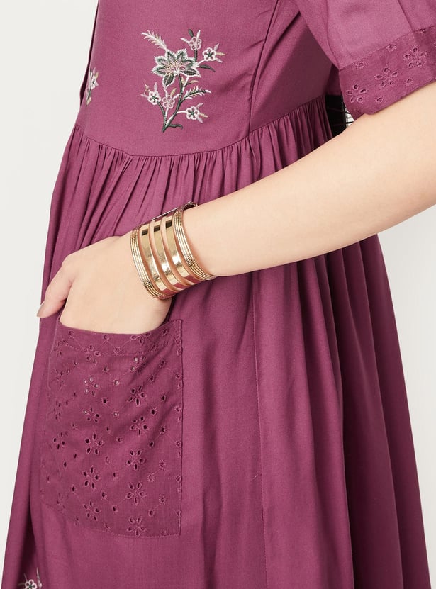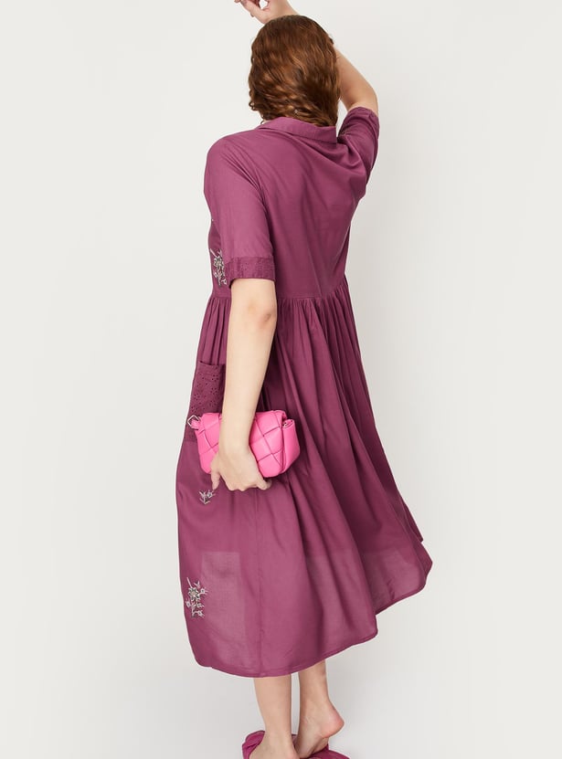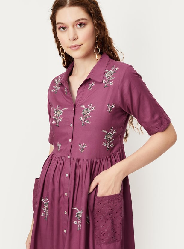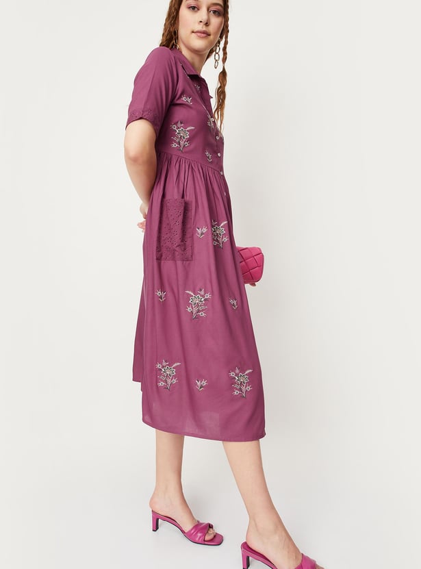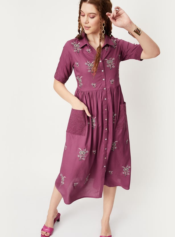 Breeze through the summer in style. This midi dress is highlighted with floral embroidery and patch pockets with a schiffli embroidered pattern. It features a collared neck, half sleeves, a gathered waist, and a button front. Pair this dress with a pair of matching block heels to take your style up a notch.