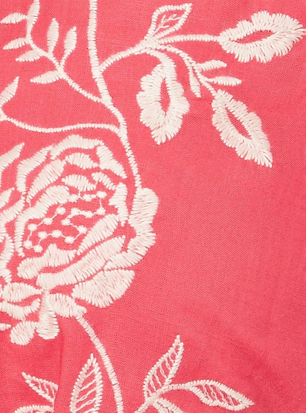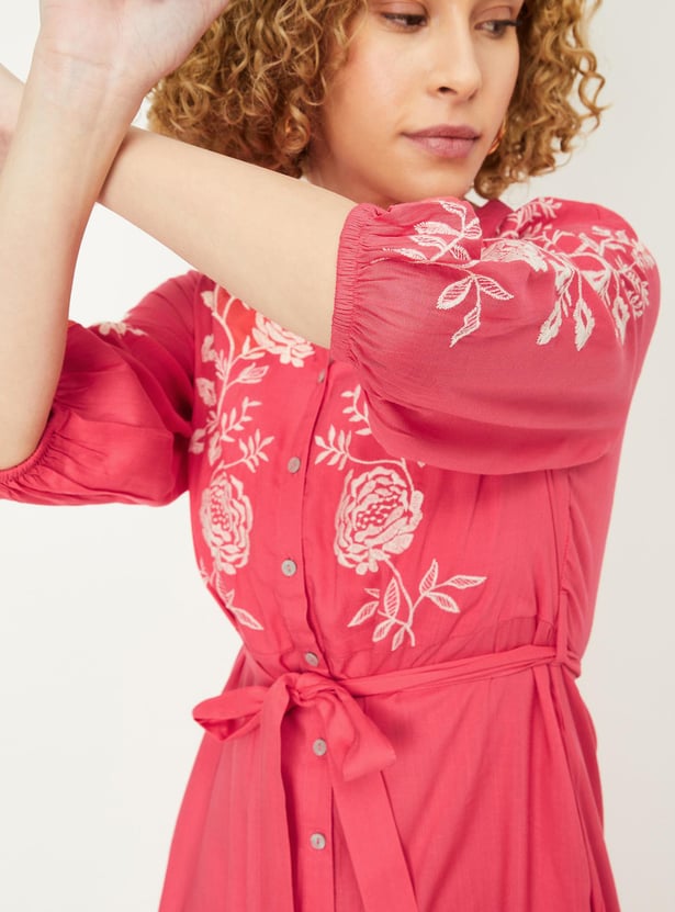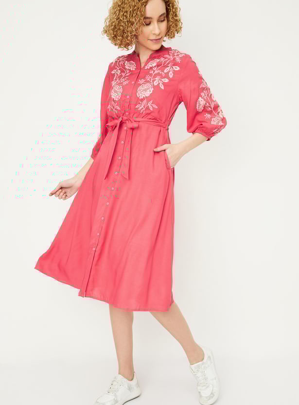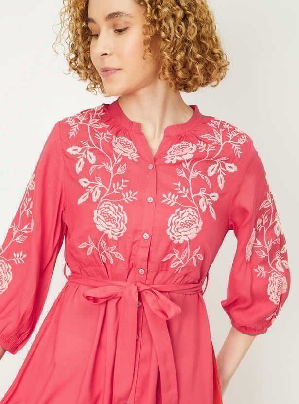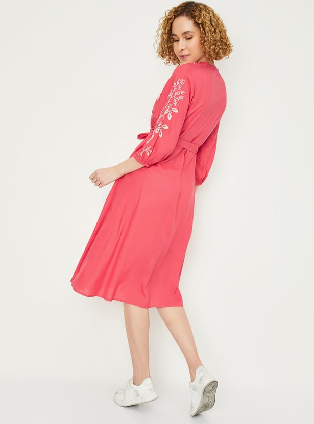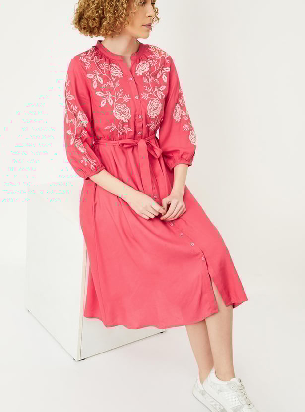 Own your style revolution with this embroidered casual dress making you look effortlessly beautiful as it features a band collar, tie-up belt, and three-quarter puffed sleeves in midi length making it a perfect dreamy outfit.