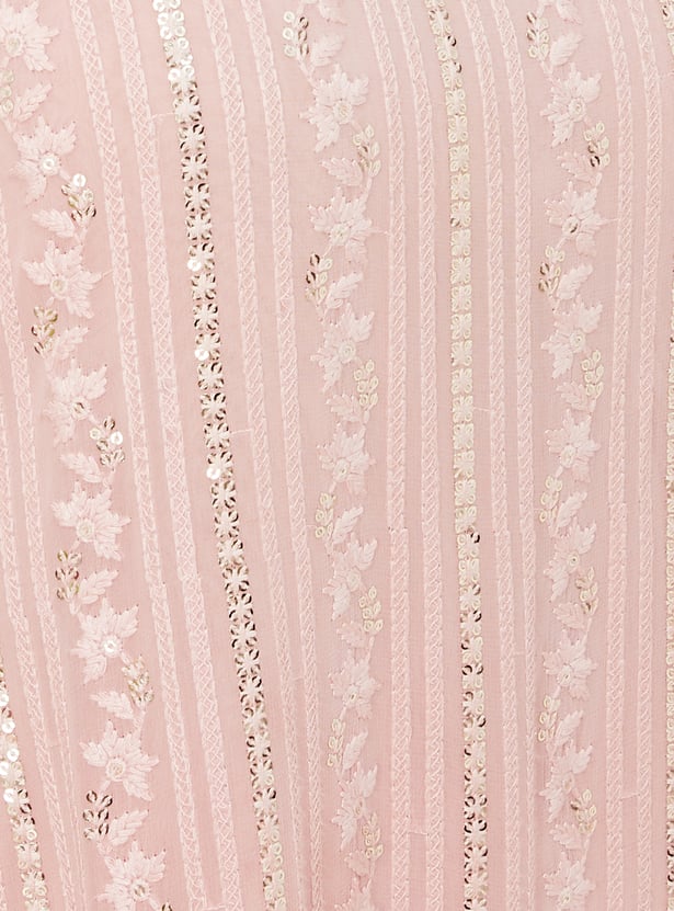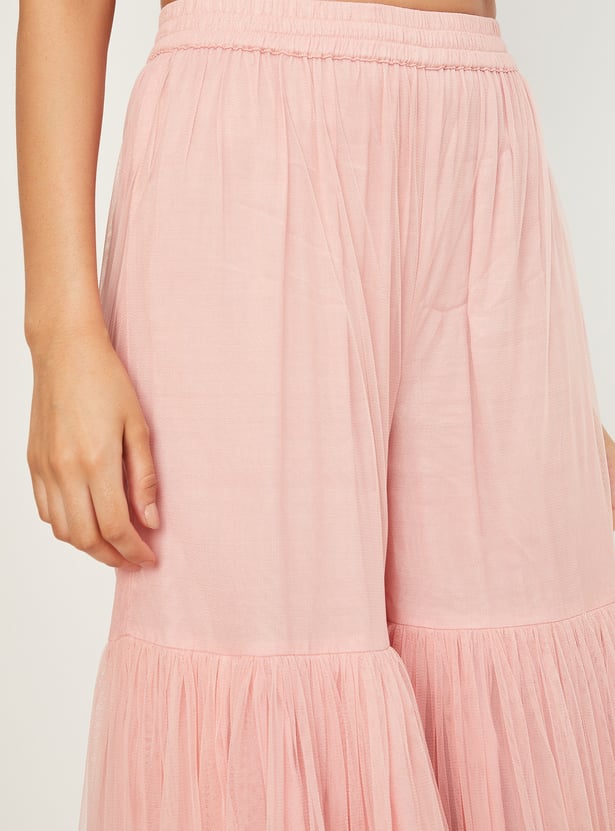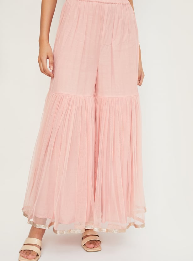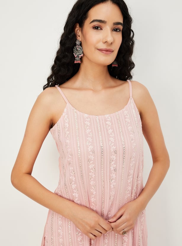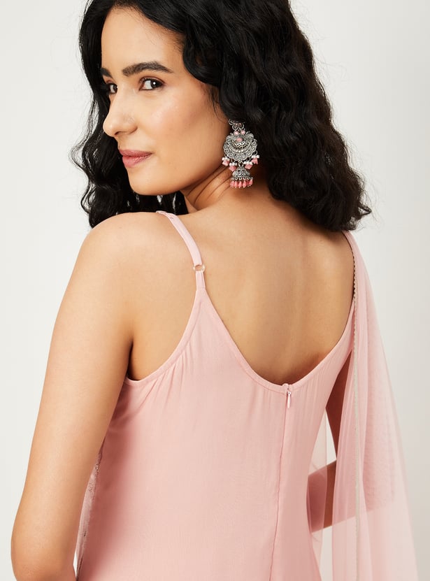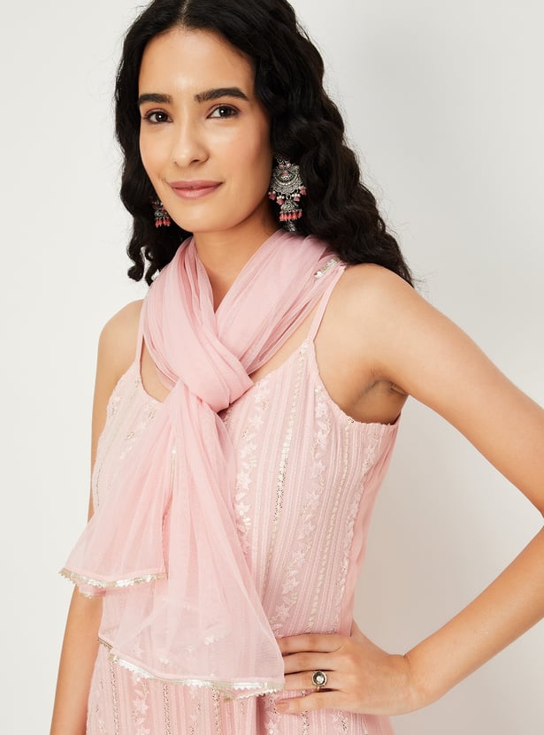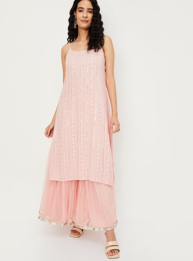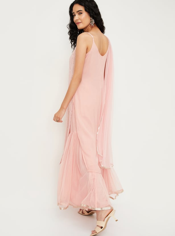 Radiate elegance in this timeless kurta set. An epitome of grace and sophistication, this set features a kurta with intricate embroidery, a scoop neck, and spaghetti straps. It is paired with elasticated sharara pants and a dupatta, making it perfect for festivities.
