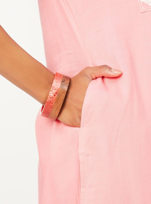 Exude elegance in this kurta that is highlighted with a beautiful embroidered yoke. It features a round neck, three-quarter sleeves, and a waist pocket.