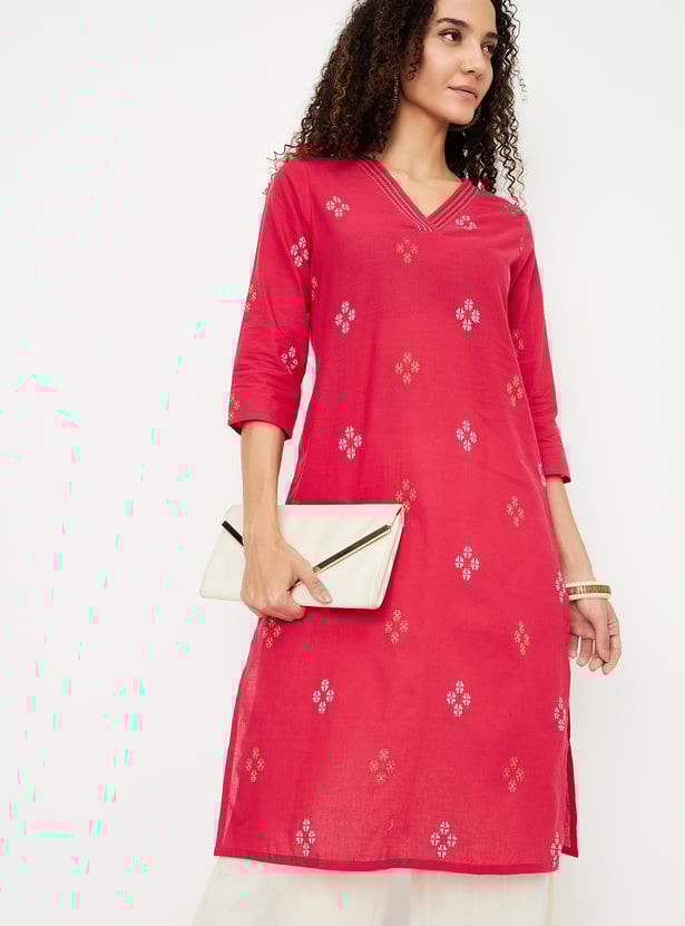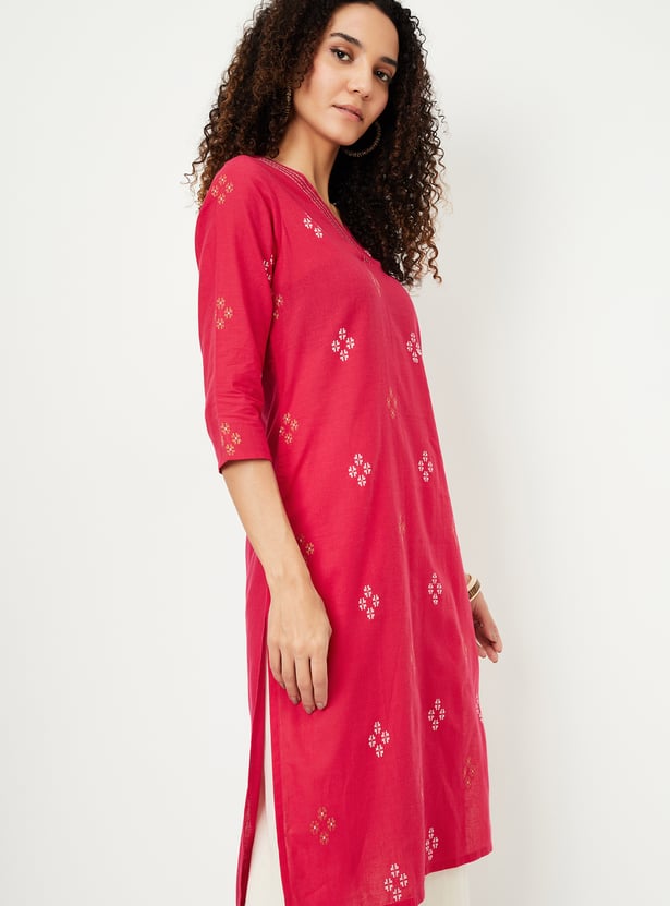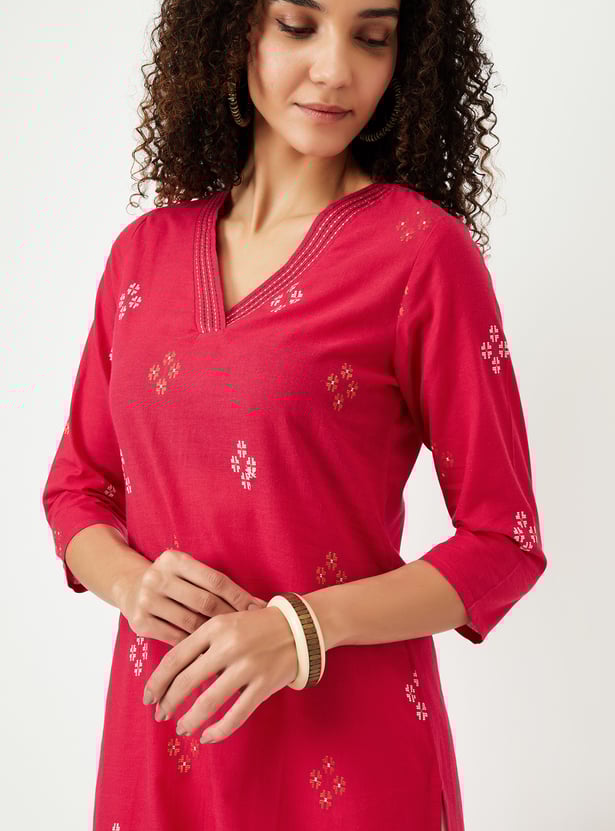 Add a little shimmer to your wardrobe with this kurta. The classic straight cut offers a flattering fit, while the three-quarter sleeves and sleek V-neck create a refined silhouette. Designed with convenient pockets and metallized embroidery, this kurta combines practicality with style.