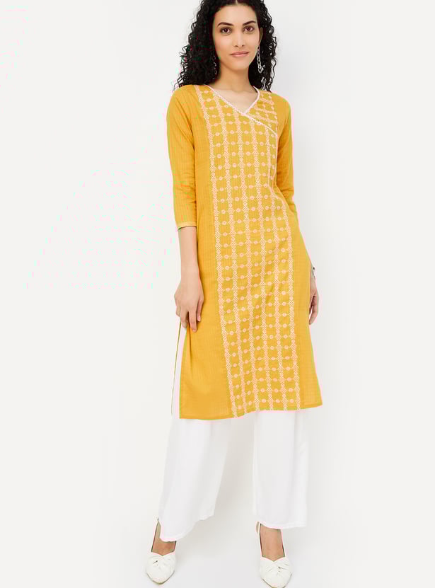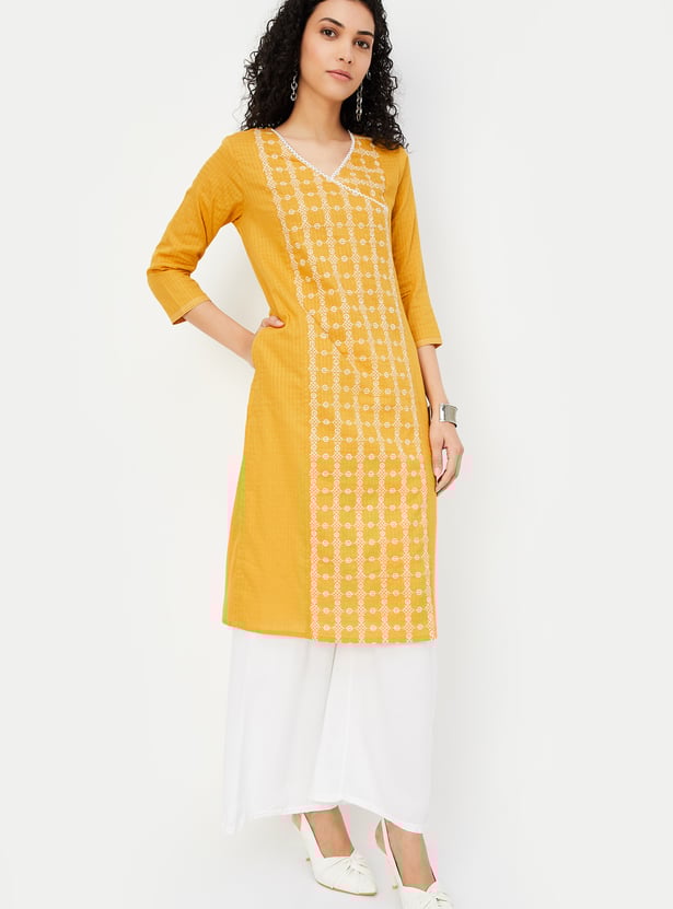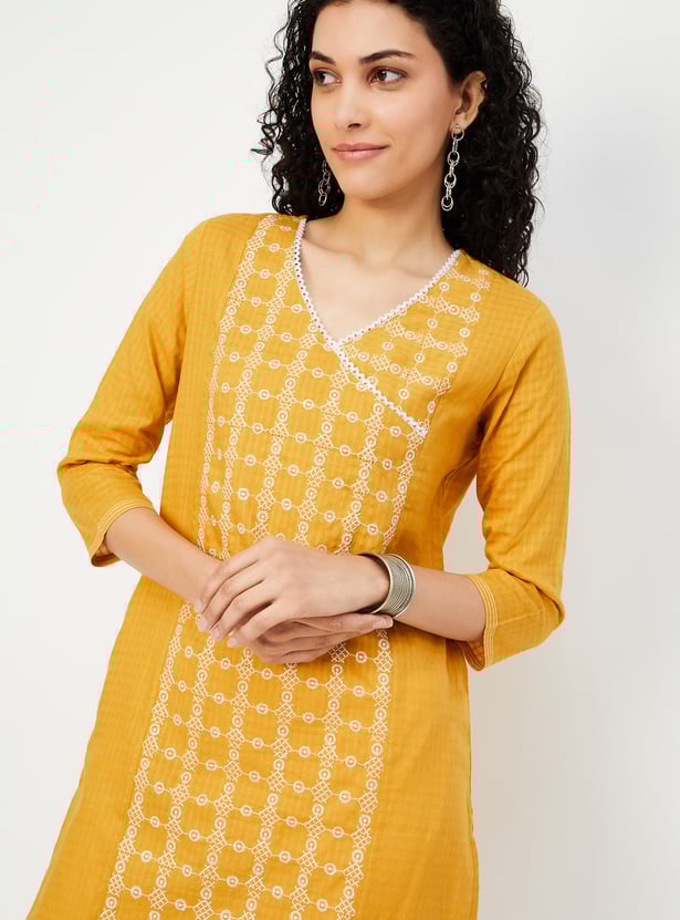 Create an effortless casual look with this stylish straight kurta, beautifully highlighted with intricate embroidery. Designed with a flattering overlapping V-neckline, a waist pocket, and three-quarter sleeves, this kurta is perfect for adding a touch of elegance to your everyday ensemble.