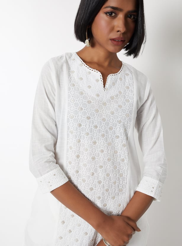 Elevate your ethnic wardrobe with this embroidered straight kurta, featuring a graceful notch neck, side pocket, 3/4th sleeves, and side slits for added comfort and style. Perfect for festive occasions or casual wear.