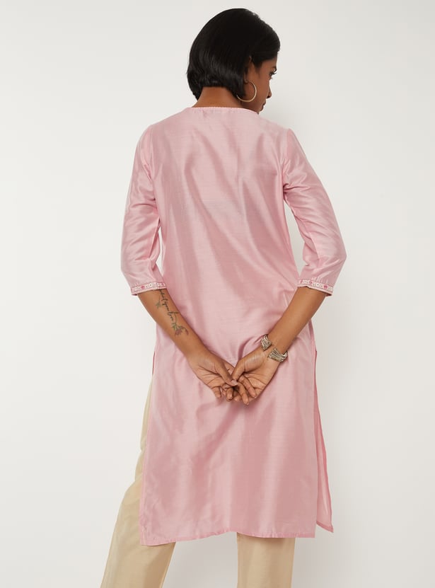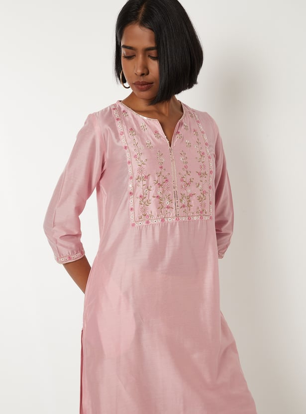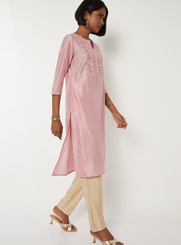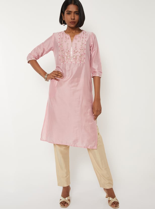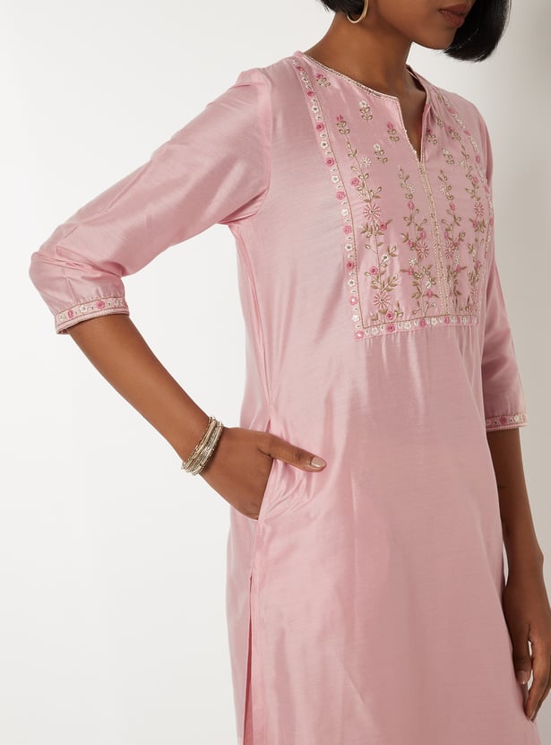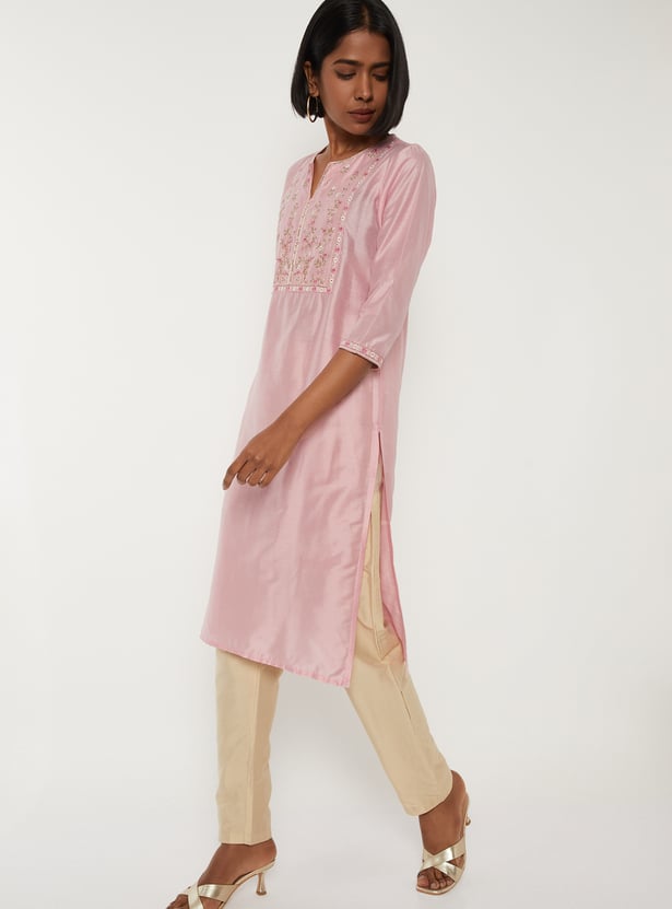 Elevate your ethnic staples with this embroidered straight kurta featuring a classic notch neckline, 3/4th sleeves, side pocket, and easy side slits for comfort.