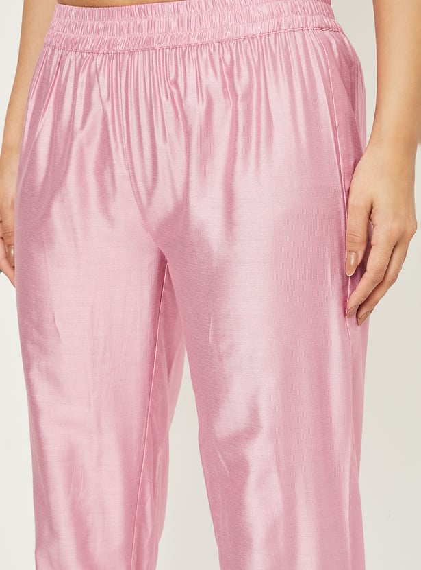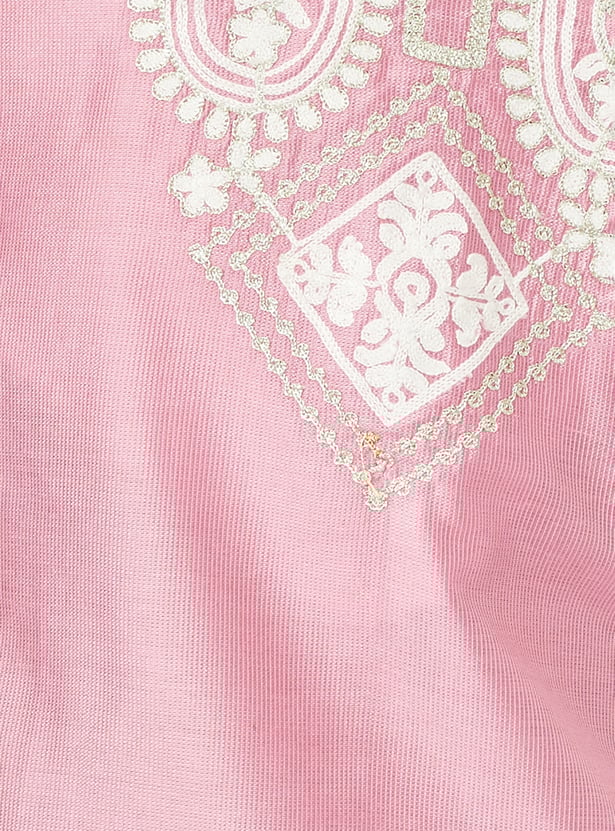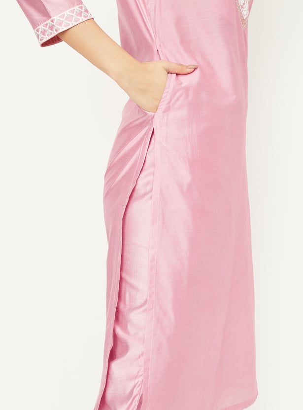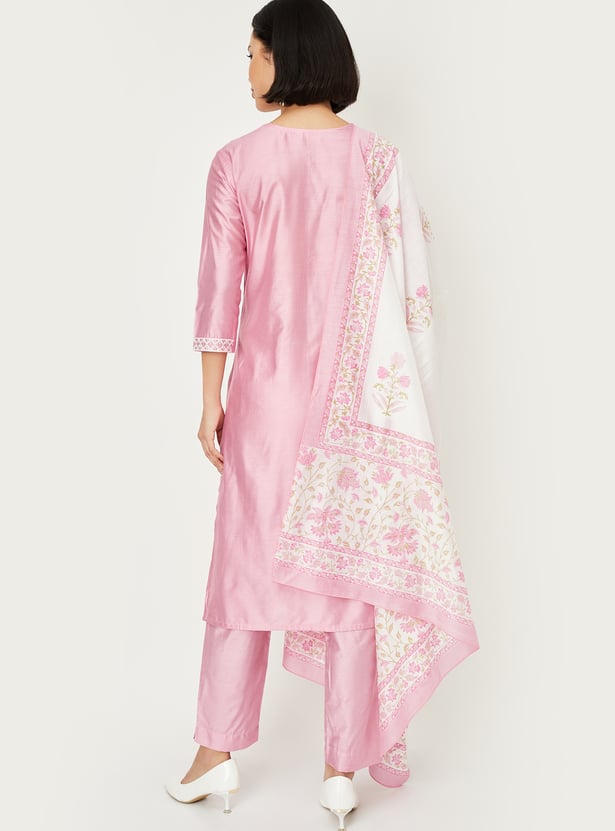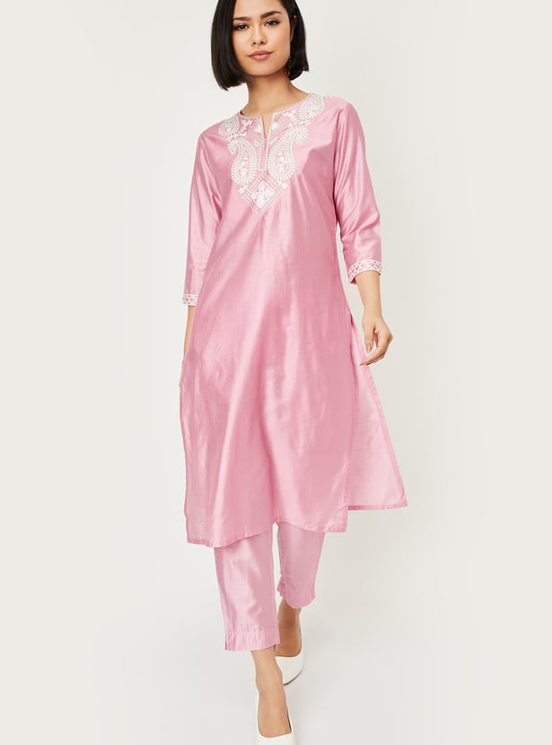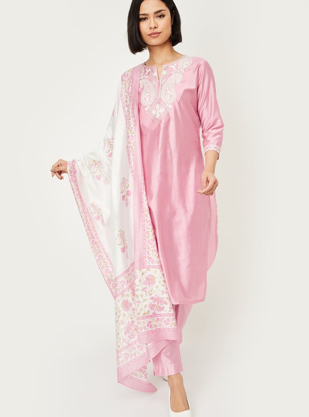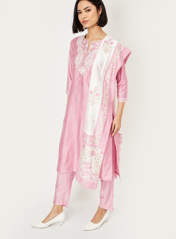 This straight kurta set features an embroidered kurta with a notch neck, 3/4th sleeves, ide pocket, and side slits for a timeless and versatile look. Paired with solid straight pants featuring an elasticated waist, this set offers a perfect blend of comfort and style. It is complemented with a matching dupatta.