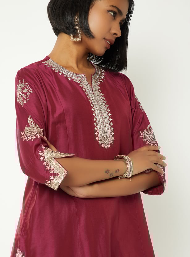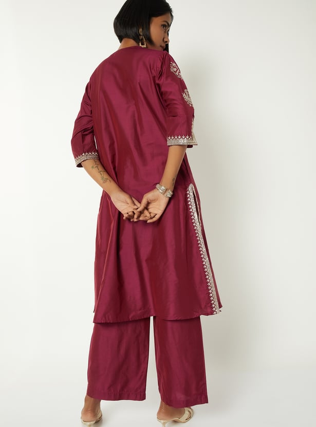 Step out in charming style with this embroidered straight kurta set. The kurta is designed with a notched neckline and 3/4th sleeves, paired with palazzos featuring an elasticated waist for all-day comfort. A perfect blend of elegance and ease.