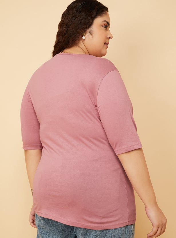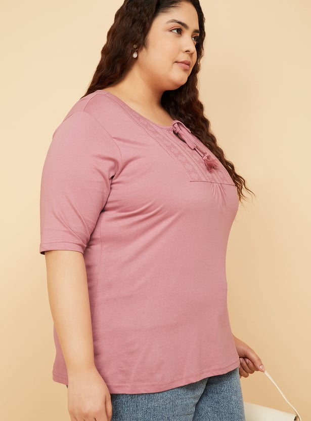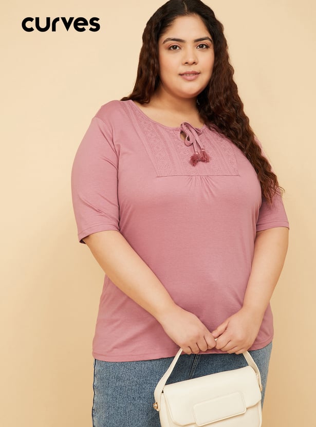 This embroidered top features a delicate tie-up neckline, half sleeves, blending feminine charm with casual ease. Soft and breathable, it’s perfect for effortless everyday style. Model Size :