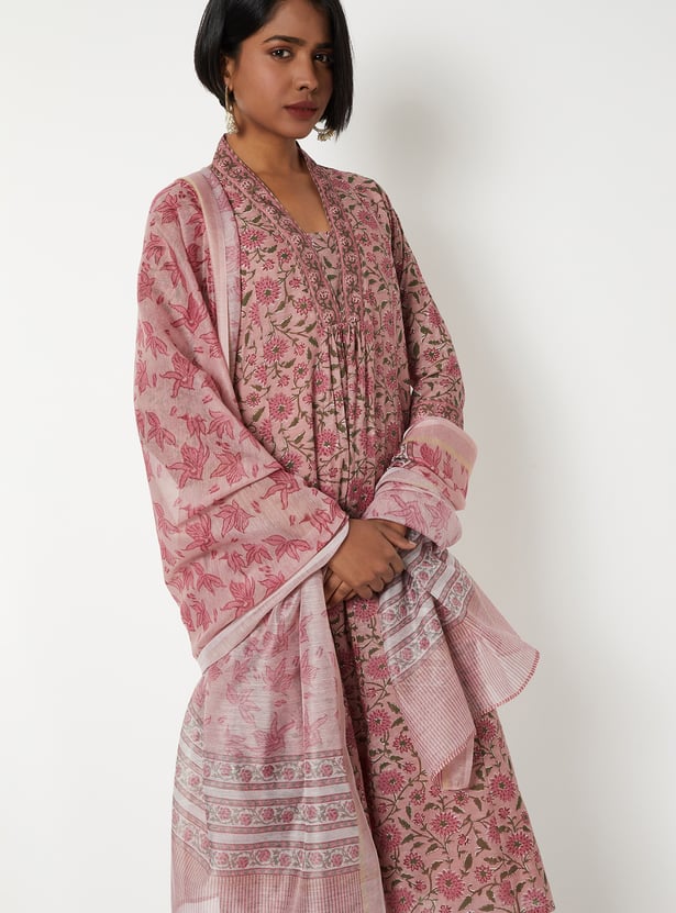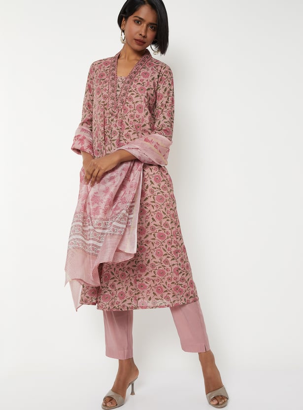 Bring effortless charm to your ethnic collection with this floral printed A-line kurta set. The kurta is designed with a stylised neckline, side pocket, and 3/4th sleeves, offering a graceful silhouette. It’s paired with matching straight pants featuring an elasticated waist and a dupatta ensuring both comfort and style