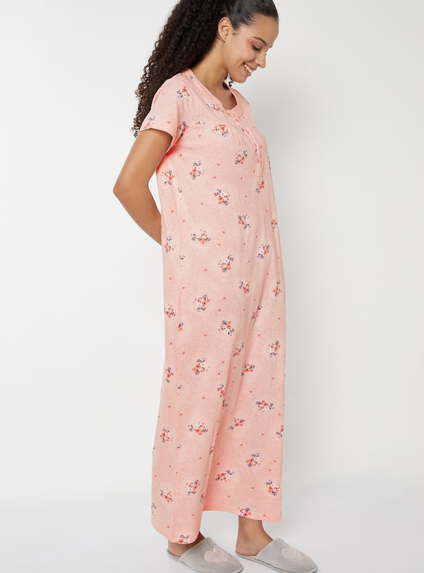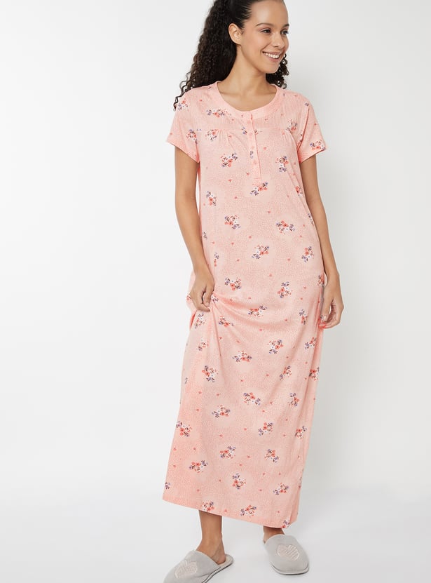 Unwind in comfort and charm with this floral print maxi night gown. Featuring a round neck, button placket, and half sleeves, it offers a relaxed fit that's perfect for restful nights and cozy mornings. Model Size :