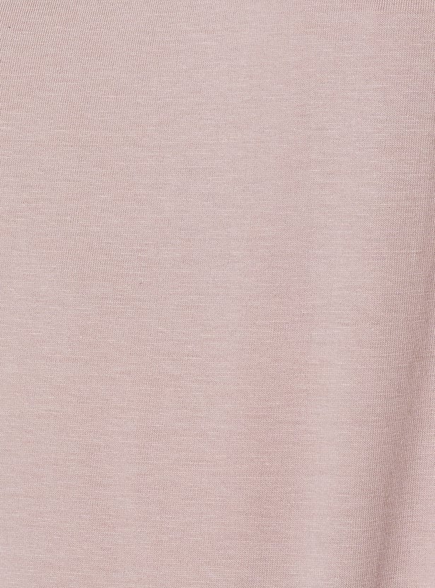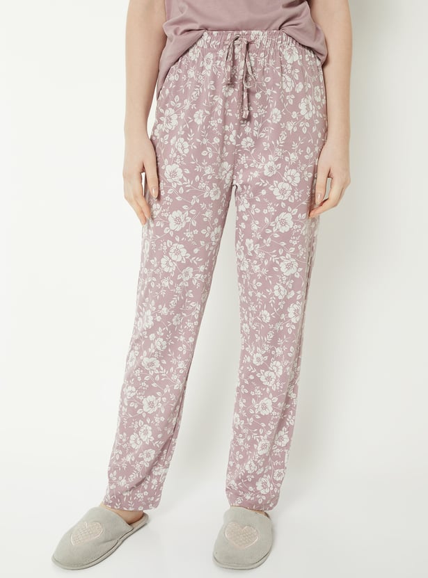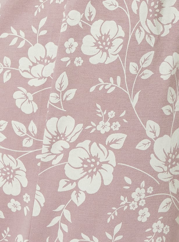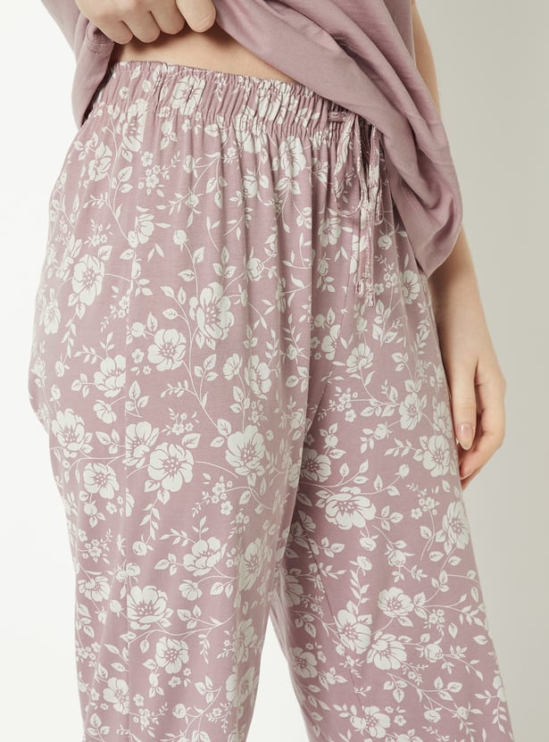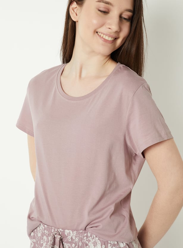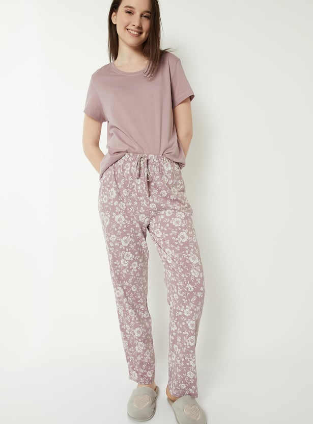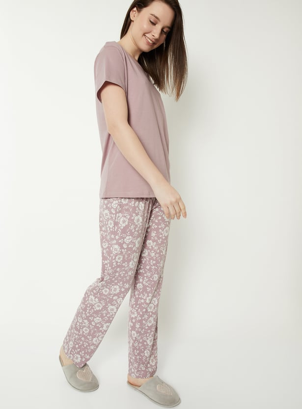 Unwind in style with this floral print set, combining comfort with charm. The solid T-shirt features a classic round neck and half sleeves for a relaxed fit. Paired with floral print pyjamas featuring a drawstring waist, it offers the perfect blend of softness and style for cosy nights and lazy mornings.
