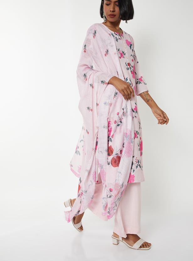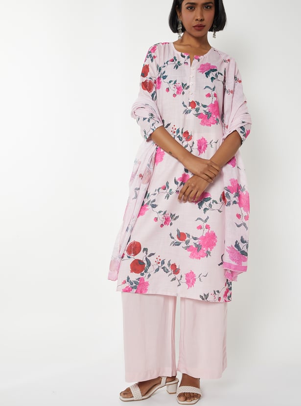 Step out in graceful charm with this floral print straight kurta set. The kurta features a notched neckline and 3/4th sleeves, paired with solid palazzos and a matching dupatta for a complete, elegant look.