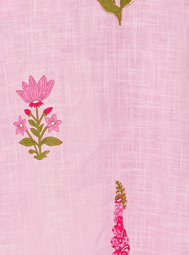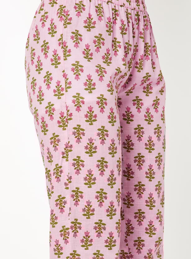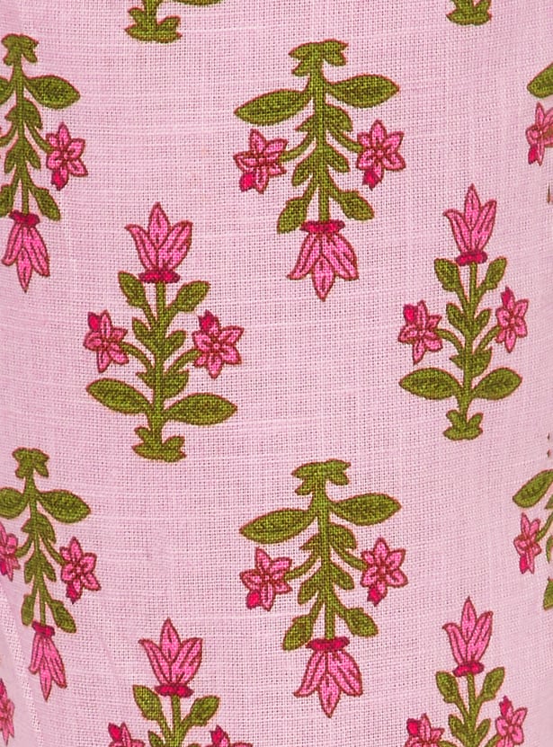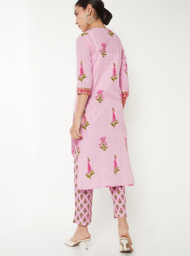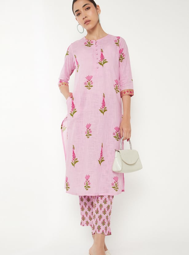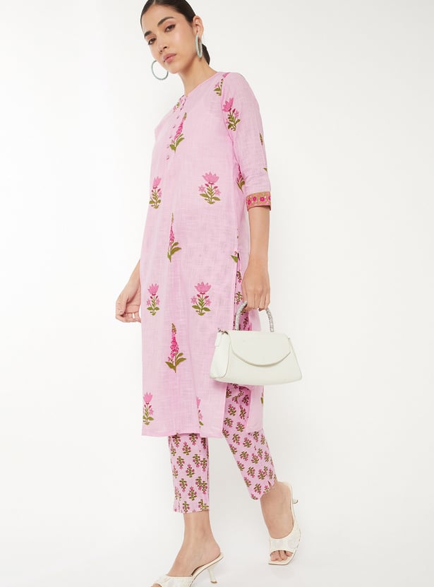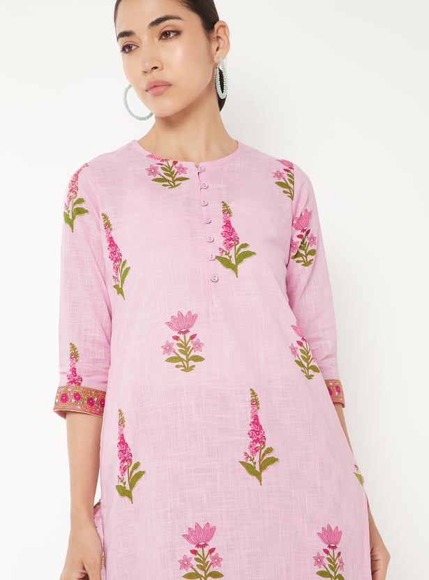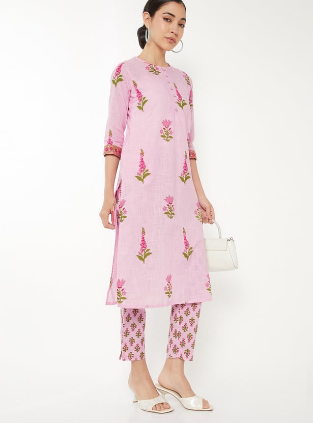 Designed with three-quarter-length sleeves, a round neck, and a knee-length silhouette, this floral-print kurta is complemented by a pair of straight pants.