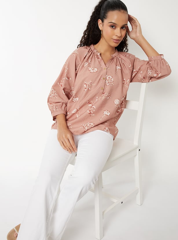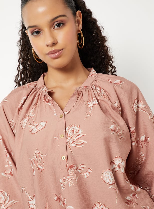 Bring a touch of charm to your everyday wardrobe with this floral print tunic. Designed with a band collar, button placket, and full sleeves, it offers a graceful blend of comfort and style.