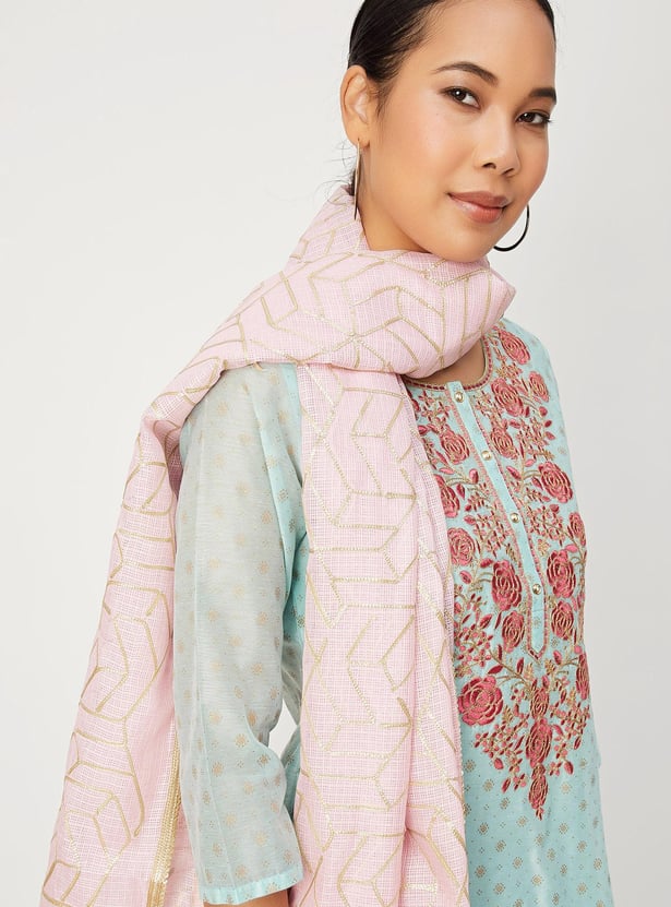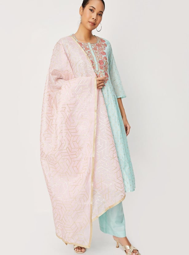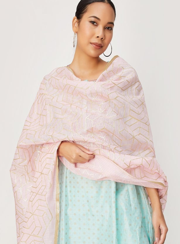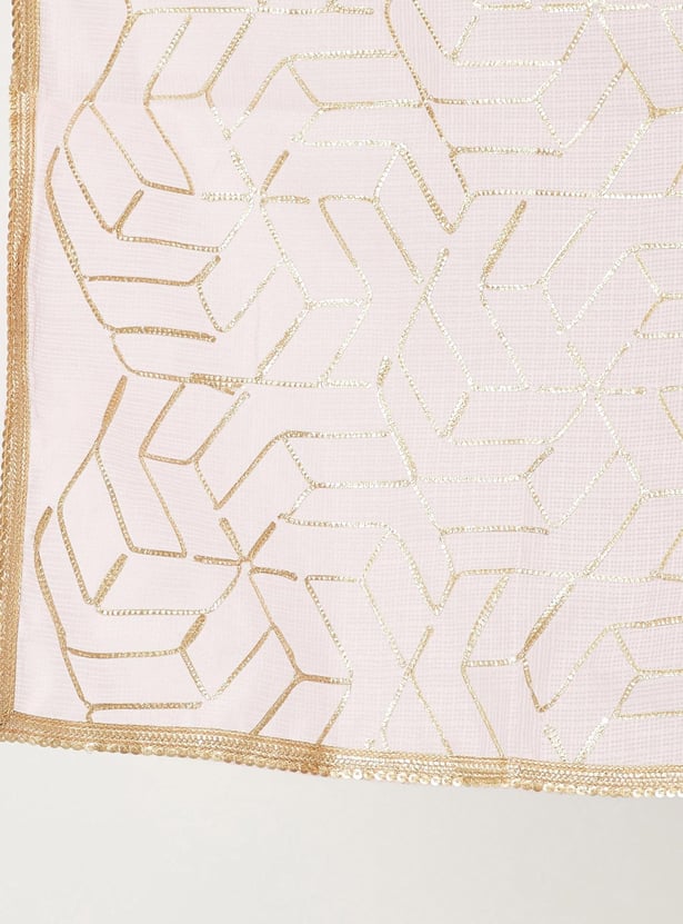 Complete your ethnic look with this gota patti work dupatta that has a border. Pair it with a kurta set and ethnic sandals for a stunning ensemble.