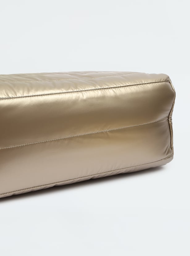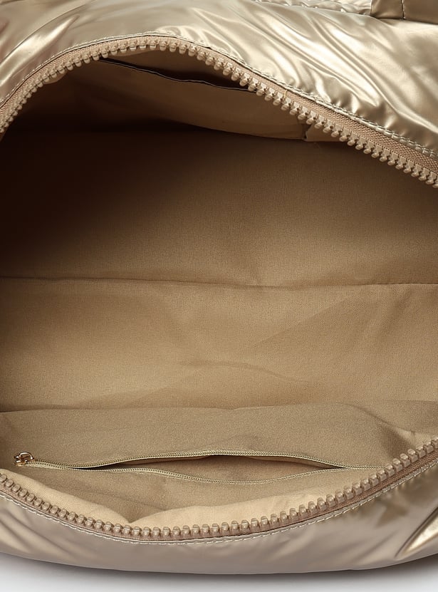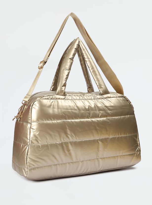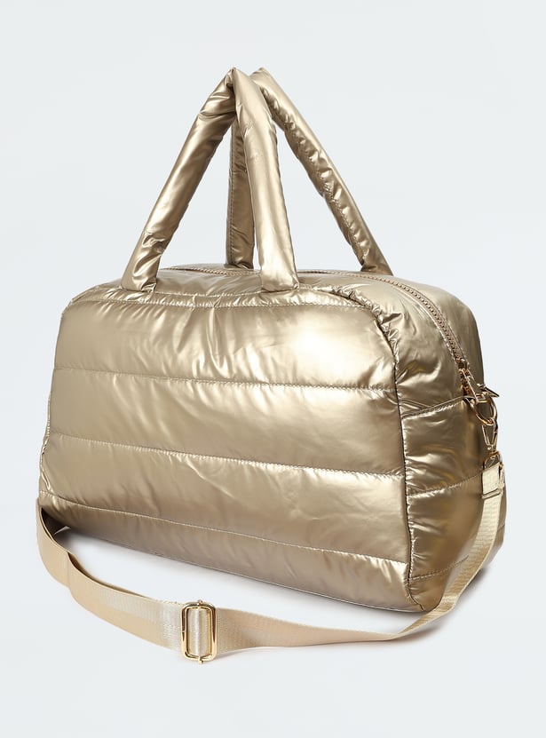 This duffle bag features a metallic surface, quilted design, flat handle, and adjustable strap. With side zip pockets and a spacious main compartment, it keeps your gear organized and ready.