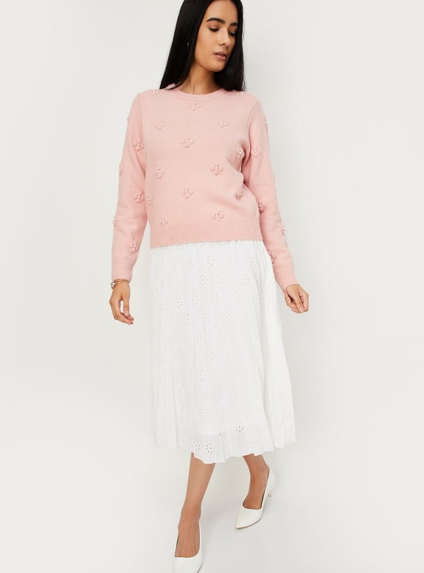 Dress for the season in style with this sweater that is highlighted with floral emboss along with pearl embellishments all over. It is designed with a round neckline and full sleeves.